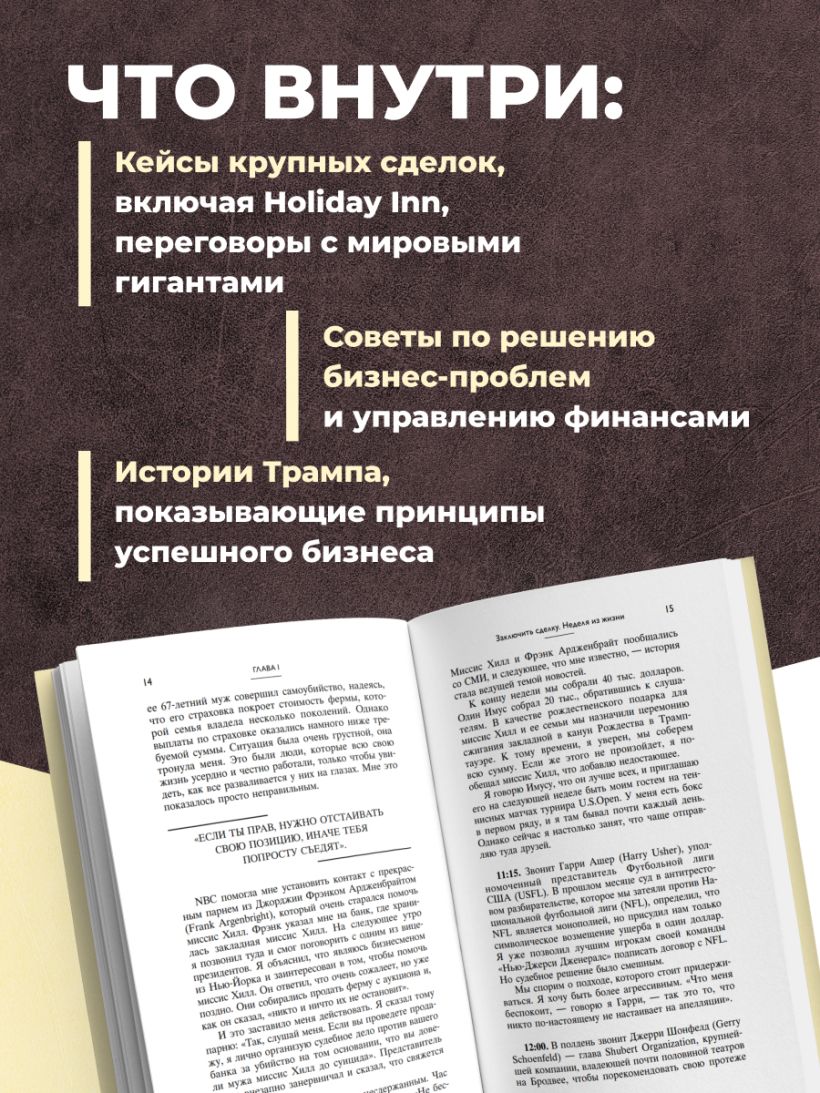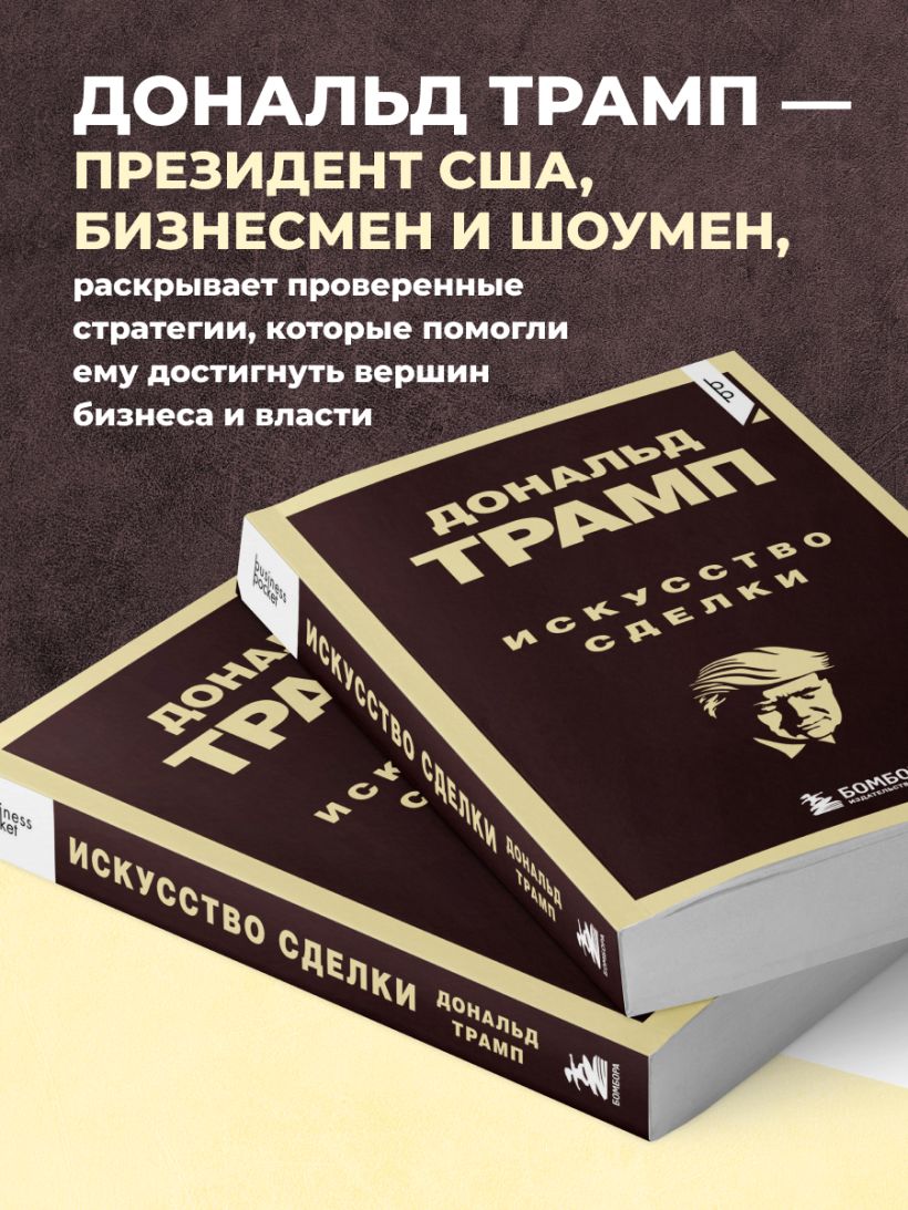 Дональд Трамп — 45-й и 47-й президент США, бизнесмен. В прошлом — шоумен и телеведущий. Человек года по версии журнала «Time» (2016). «Искусство сделки» — гид по разумному подходу к личным финансам. Трамп, имея за плечами огромный предпринимательский опыт, рассказывает о своем видении правильного бизнеса, вспоминает яркие сделки и делится проверенными временем рекомендациями для успеха. Вы узнаете секреты успешных сделок из первых уст!
