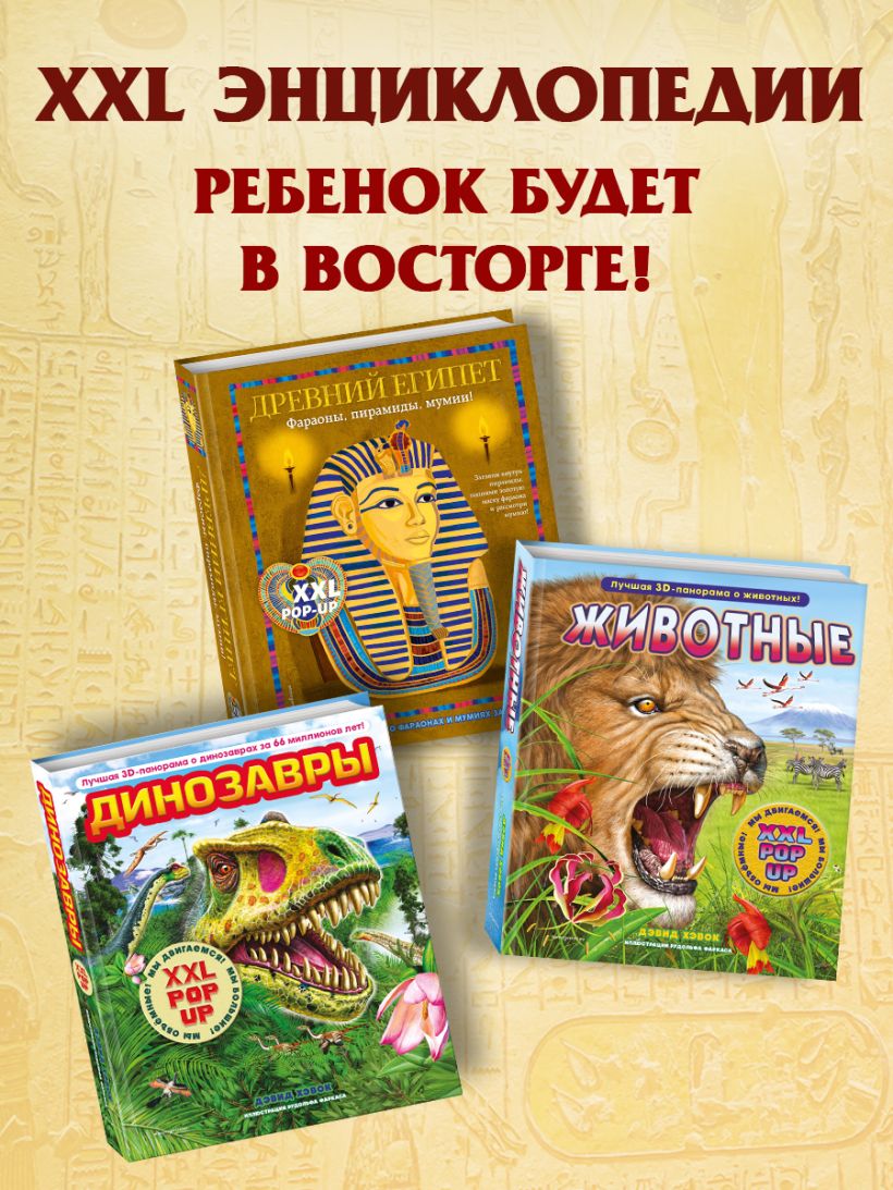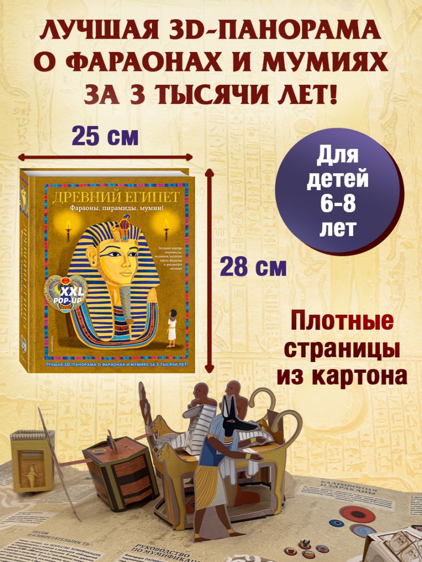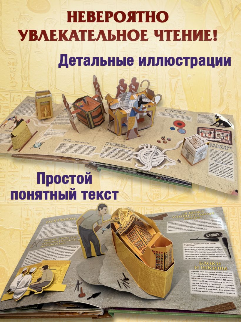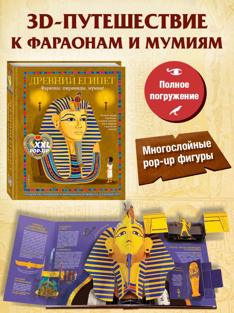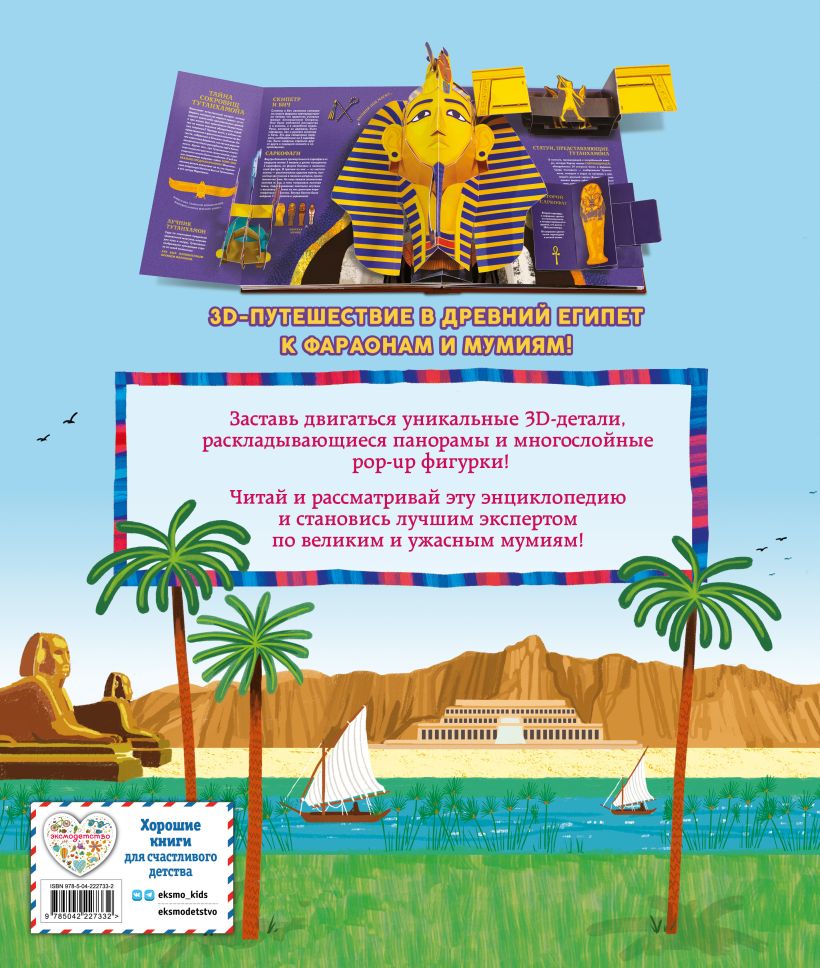 Захватывающая энциклопедия для юных исследователей Древнего Египта! В книге читателя ждут гигантские объёмные модели мумий, гробниц, панорамные виды древнего города, раскрывающиеся элементы и многое другое, превращающие книгу в увлекательное 3D-путешествие. Ребёнок узнает самые невероятные факты о жизни прошедшей эпохи, а уникальные pop-up фигурки и интерактивные элементы сделают чтение очень весёлым! Издание предназначено для дошкольного возраста, текст для чтения взрослыми детям.