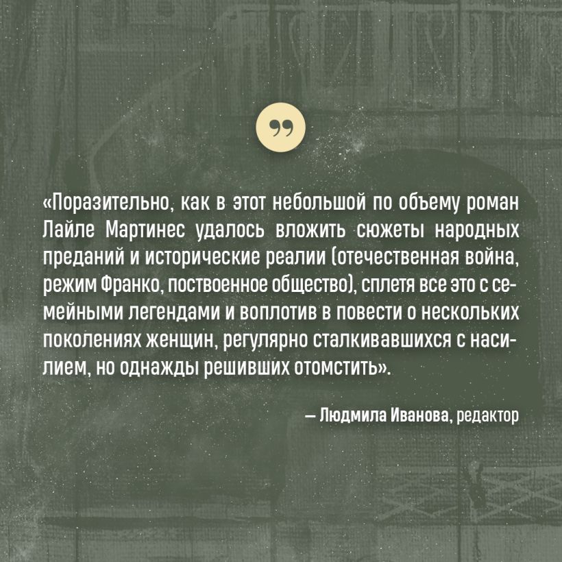 «Поразительно, как в этот небольшой по объему роман Лайле Мартинес удалось вложить сюжеты народных преданий и исторические реалии (отечественная война, режим Франко, поствоенное общество), сплетя все это с семейными легендами и воплотив в повести о нескольких поколениях женщин, регулярно сталкивавшихся с насилием, но однажды решивших отомстить». — Людмила Иванова, редактор