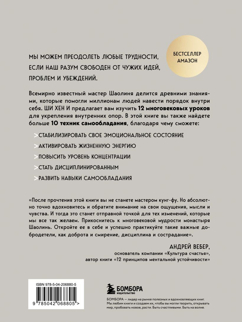 Ну а книга поможет прикоснуться к многовековой мудрости монастыря Шаолинь. Открыть в себе и успешно практиковать такие важные добродетели, как доброту и смирение, дисциплину и сострадание. И кто знает, как изменится ваша жизнь. Но в ней точно будет меньше страдания и больше покоренных вершин во всех сферах». — Андрей Вебер, основатель компании «Культура счастья», автор книги «12 принципов ментальной устойчивости»