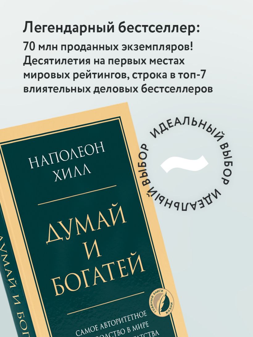 Книга основана на более чем 500 интервью с самыми состоятельными людьми Америки. На протяжении десятилетий «Думай и богатей» занимает первые строчки мировых рейтингов среди книг по обретению богатства и входит в Топ-7 самых влиятельных бизнес-бестселлеров всех времен.