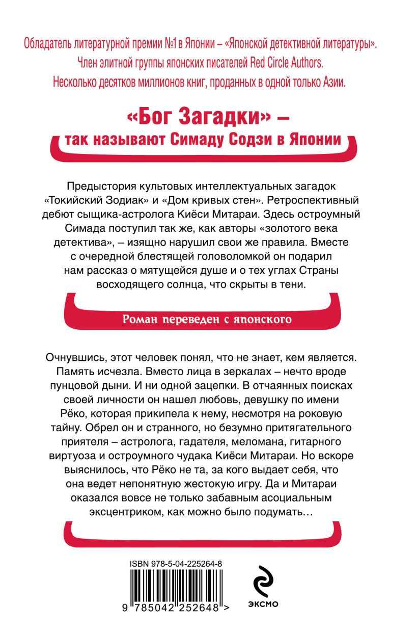 Предыстория культовых интеллектуальных загадок «Токийский Зодиак» и «Дом кривых стен». Ретроспективный дебют сыщика-астролога Киёси Митараи. Здесь остроумный Симада поступил так же, как авторы «золотого века детектива», — изящно нарушил свои же правила. Вместе с очередной блестящей головоломкой он подарил нам рассказ о мятущейся душе и о тех углах Страны Восходящего Солнца, что скрыты в тени.