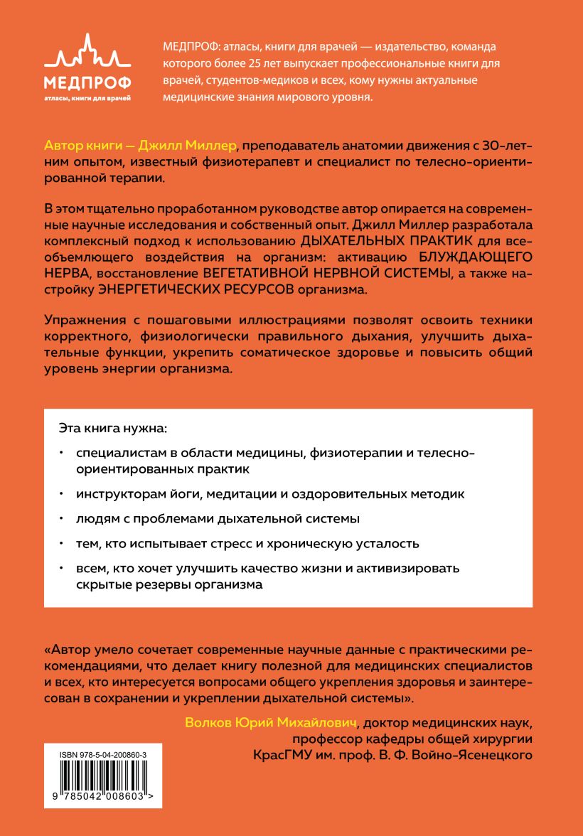 Джилл Миллер, преподаватель анатомии движения, расскажет, как связаны дыхательные практики с работой мышц, фасций и блуждающего нерва, и как применить эти знания в специальных упражнениях, которые помогут укрепить тело и улучшать эмоциональное состояние. Практики из книги доступны каждому: от спортсменов и преподавателей до тех, кто просто ищет способ справиться с мышечными зажимами, улучшить сон, пищеварение и избавиться от стресса.