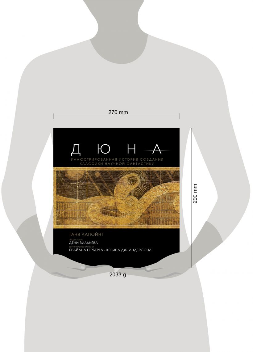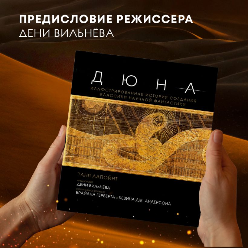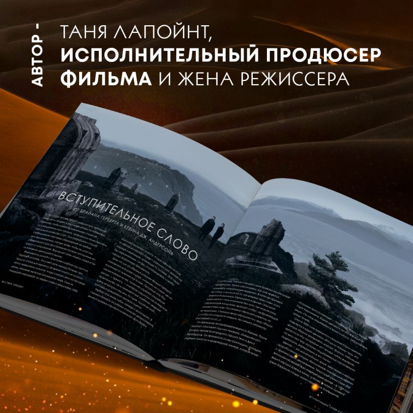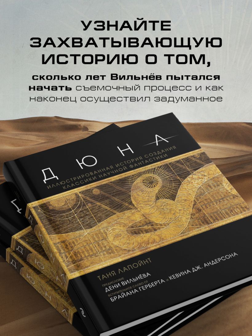 Таня Лапойнт расскажет вам захватывающую историю о том, сколько лет Вильнёв пытался начать съемочный процесс и как наконец осуществил задуманное. Помимо самого режиссера в создании книги участвовали и члены съемочной команды, они расскажут вам обо всех этапах кинопроизводства — от создания концепт-артов и поиска локаций по всему миру до пошива костюмов и сложного грима. А дополнительным бонусом станут эксклюзивные интервью с ключевыми актерами, среди которых Тимоти Шаламе, Ребекка Фергюсон, Оскар Айзек и Джейсон Момоа. И все это в сопровождении уникальных фотографий со съемочного процесса, концепт-артов и первых раскадровок самого режиссера. Погрузитесь в завораживающий мир «Дюны»!