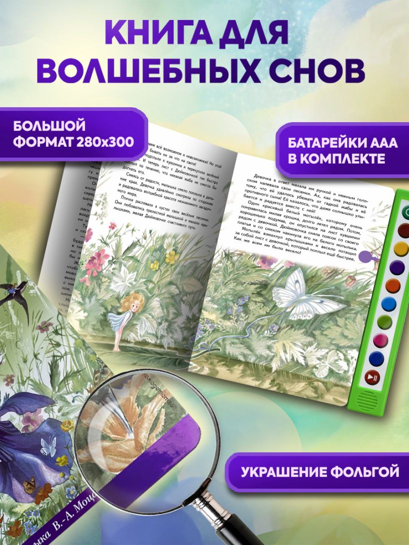 Музыкальная книга-плеер — это прекрасное сочетание традиционной книги и современных технологий. Красочное иллюстрированное издание классической сказки дополнено звуковым модулем-плеером. Яркие, крупные кнопки на панели модуля позволяют прослушать сказку как по главам, так и полностью, от начала до конца, а также сделать паузу в прослушивании. Время звучания всей сказки — 25 минут, РЕКОРД СРЕДИ ЗВУКОВЫХ КНИГ. Наша книга — это идеальный вариант «сказки на ночь»: пока ребёнок слушает книгу и засыпает, взрослые могут заняться своими делами. Профессиональное художественное чтение текста сопровождается завершёнными музыкальными композициями — шедеврами мировой классики. Только в наших книгах-плеерах используются дополнительные звуки (шелест листвы, пение птиц и т. п.), создающие эффект присутствия на настоящем спектакле!