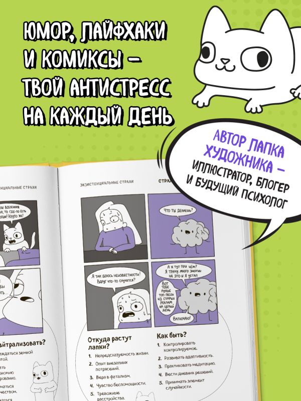 «Эта книга как теплый разговор с собой в моменты тревоги. С юмором, легкостью и неожиданной глубиной она помогает взглянуть на страхи по-другому — мягко, бережно и с улыбкой. Кот-психолог протянет свою лапку помощи. И расскажет, как легче и спокойнее воспринимать эту жизнь». — Любовь Стяпшина, автор и иллюстратор метафорических открыток «Дом твоего сердца»