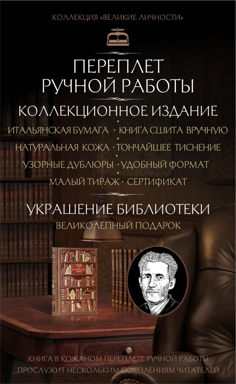 В каждом экземпляре — избранные цитаты и гравированный портрет автора, отпечатанные на дизайнерской бумаге, изготовленной на четверть из натуральной кожи. Переплеты созданы по традиционной для XIX века технологии из гладкой натуральной кожи и украшены тремя видами рельефного тиснения — золотым, рельефным и красочным. Форзацы книги из дизайнерской тонированной бумаги и тисненные золотом орнаментальные дублюры. Каптал и ляссе из шелка и трехсторонний торшонированный обрез.