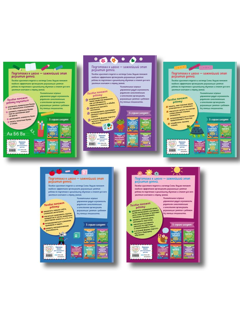 Комплект из трех развивающих тетрадей для детей 4, 5, 6 лет от издательства «Эксмо» — это настоящая находка для родителей будущих первоклассников при подготовке к школе. Пособия соответствуют ФГОС, четко структурированы и помогут быстро и надежно подготовить руку к письму. Ребенок тренирует аккуратность и усидчивость, концентрацию и внимание в игре: обводит по пунктиру и узнает разные типы линий, проходит веселые лабиринты, рисует узоры и картинки по точкам и клеткам, запоминает цифры, соотносит цифру и число, знакомится с математическими символами, штрихует, дорисовывает половинки предметов. Эти книги — обучающие раскраски с крупными картинками! Внизу каждой страницы — специальные значки для оценки выполненных заданий. Поставив галочку в клетках «да» или «нет», ребенок сможет проконтролировать себя, а нарисовав ротик у смайлика вверх или вниз — оценить результат (хорошо / не очень хорошо). Регулярные занятия по прописям-тренажерам помогут сделать подготовку к школе быстрой и эффективной, развить мелкую моторику, графические и математические навыки, логику и творческие способности. Книги будут полезны девочкам и мальчикам для занятий дома или в детском саду. Эти развивашки можно брать в дорогу, чтобы весело и с пользой провести время. Комплект станет отличным подарком малышу на любой праздник — Новый год, день рождения и просто без повода.