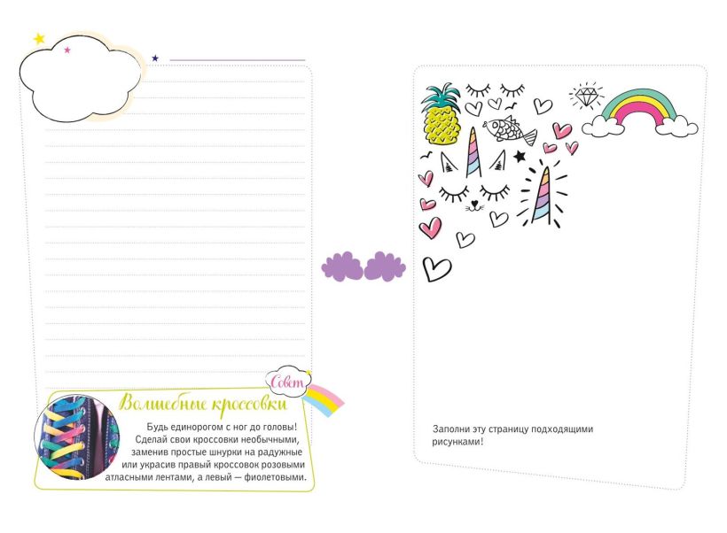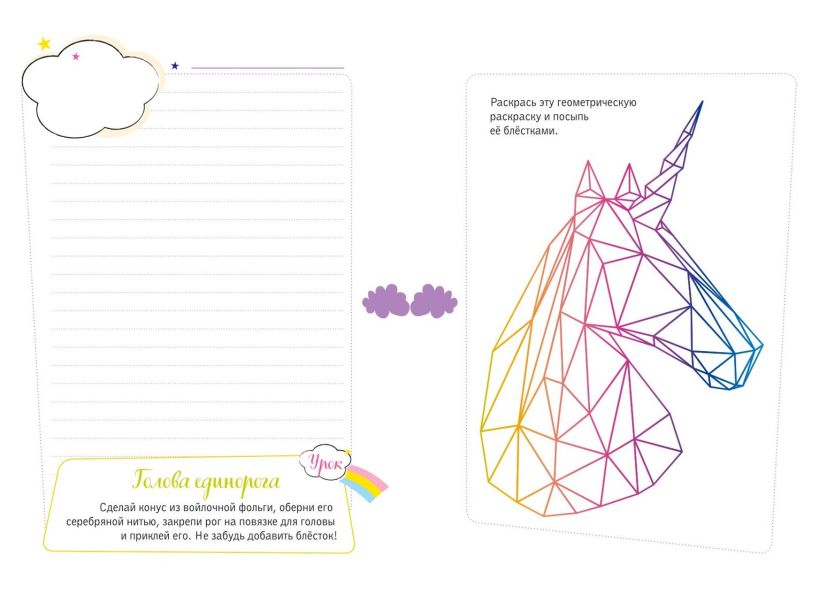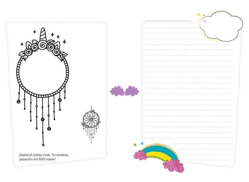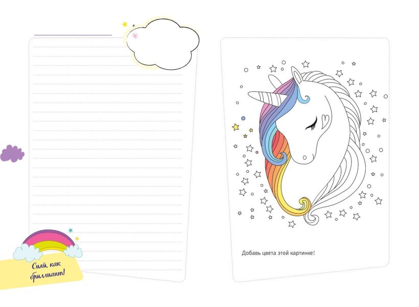 Перед тобой не просто дневничок! Это креативное пространство, подсказывающее любителям единорогов идеи творчества и поделок. Планируй дела и параллельно учись рисовать, пройди весёлые тесты и просто весело проведи время за раскрашиванием!
