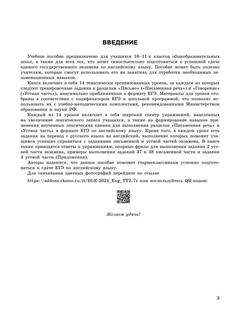 Издание адресовано учащимся старших классов, планирующим сдавать ЕГЭ по английскому языку. В книге приводится уникальная авторская методика подготовки к самым сложным разделам ЕГЭ по английскому языку — «Письмо» («Письменная речь») и «Говорение» («Устная речь»): • комплекс упражнений, сгруппированных в 14 тематических уроков; • 28 тренировочных вариантов для подготовки к разделу «Письмо»; • 56 тренировочных вариантов для подготовки к устной части; • опорные фразы для выполнения заданий разделов «Письмо» и «Говорение»; • примеры выполнения заданий 37 и 38 письменной части и задания 4 устной части; • шаблоны устного ответа. К пособию прилагается обширный банк цветных иллюстраций в электронном виде для выполнения заданий устной части, доступный по QR-коду. Книга будет полезна учителям английского языка, так как дает возможность эффективно организовать подготовку учащихся к ЕГЭ непосредственно на уроках, в процессе изучения учебного материала. Материалы пособия помогут учащимся приобрести практические навыки выполнения заданий из разделов «Письмо» («Письменная речь») и «Говорение» («Устная часть»), значительно увеличить лексический запас и качественно подготовиться к ЕГЭ по английскому языку.