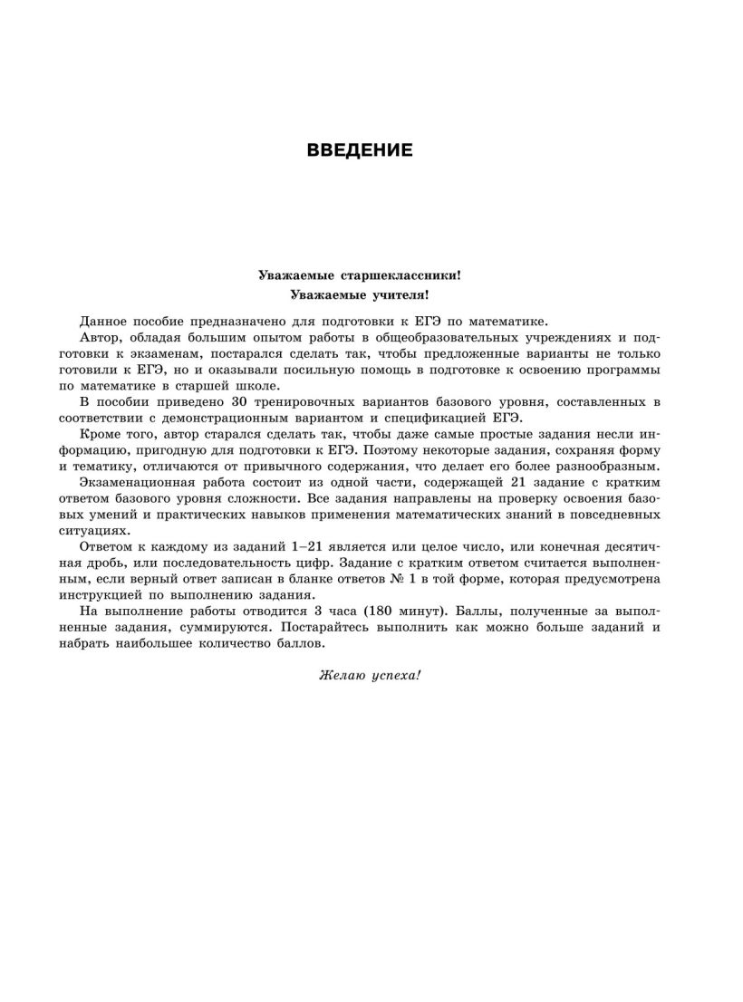 Издание адресовано учащимся старших классов и направлено на подготовку к ЕГЭ по математике базового уровня. Пособие содержит 30 тренировочных вариантов, составленных с учетом требований ЕГЭ, и ответы ко всем заданиям. Каждый вариант включает задания разных типов и уровней сложности. С помощью данной книги для школьников учащиеся смогут ознакомиться с тестом, выполнить его с учетом реального времени и оценить свой уровень готовности к ЕГЭ, а учителя — эффективно организовать учебный процесс и подготовку к экзамену.