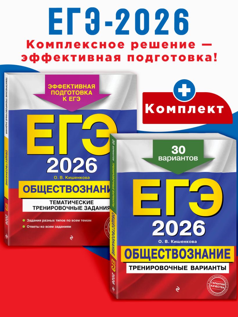 В комплект вошли книги: «ЕГЭ-2026. Обществознание. Тематические тренировочные задания» и «ЕГЭ-2026. Обществознание. Тренировочные варианты. 30 вариантов», адресованные выпускникам старшей школы для подготовки к ЕГЭ.