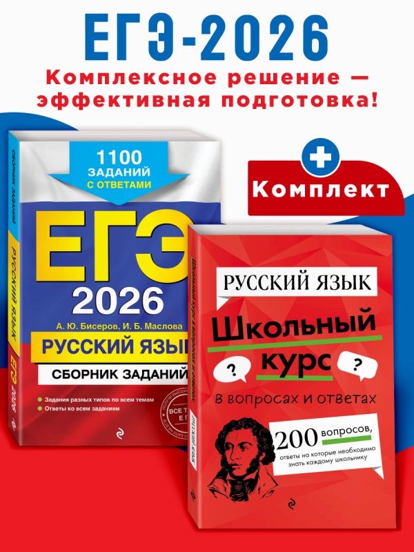 В комплект вошли книги: «ЕГЭ-2026. Русский язык. Сборник заданий: 1100 заданий с ответами» и «Русский язык» из серии «Школьный курс в вопросах и ответах», адресованные выпускникам старшей школы для подготовки к ЕГЭ по русскому языку.