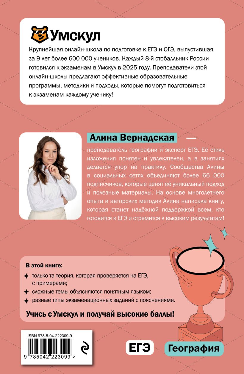 Эксклюзивный справочник от издательства «Эксмо» и топовой онлайн-школы «Умскул», выпустившей за 9 лет более 600 000 учеников, поможет каждому прийти к заветным баллам на ЕГЭ-2026 по географии. В книжке только самая актуальная и нужная для экзамена теория, а также разбор разных типов заданий!