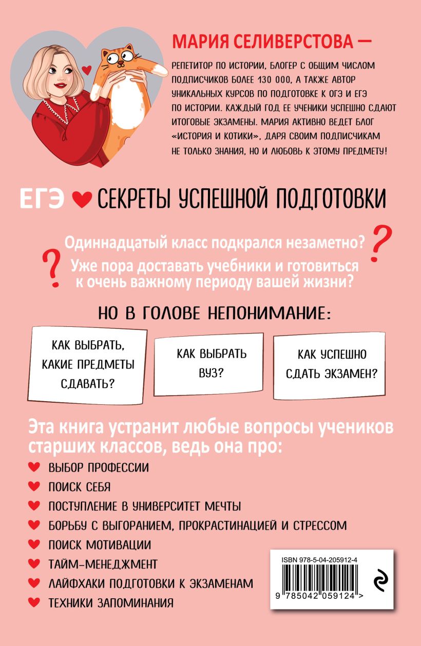 Автор Мария Селиверстова — репетитор со стажем, блогер с общим числом подписчиков более 130 000, а также основатель онлайн-школы «История и котики»! Она знает из собственной практики, как сдать ОГЭ и ЕГЭ успешно и без малейшего стресса. Авторские техники и лайфхаки Марии, изложенные в пособии, точно станут той самой палочкой-выручалочкой для каждого ученика 10-11 классов!