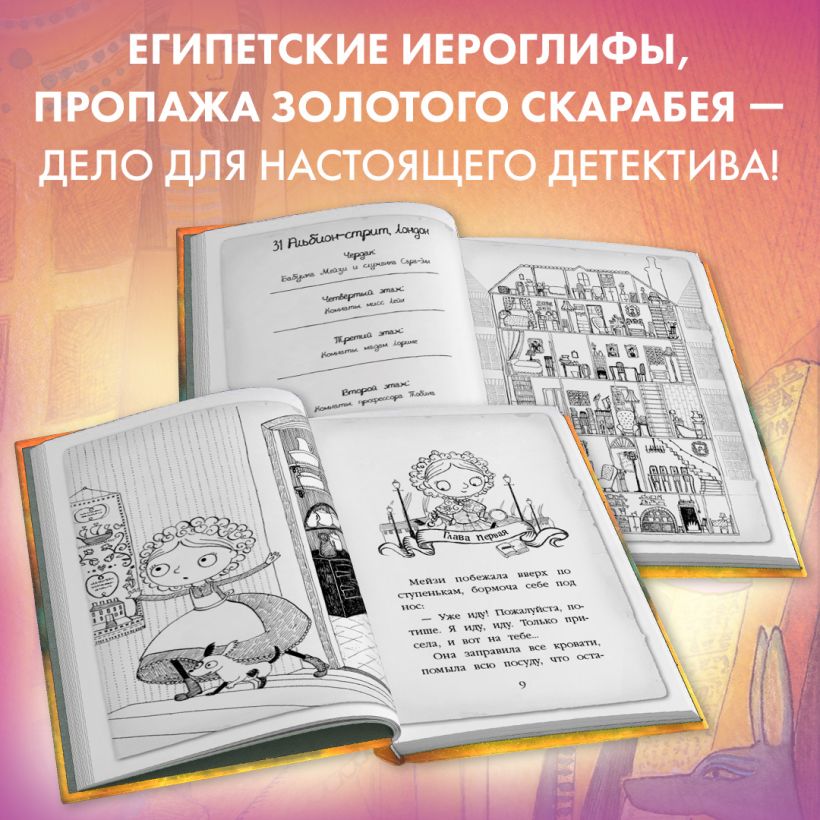 Папа Мейзи — моряк, все время в плаваниях, и девочка очень давно его не видела. Папа не забывает свою дочку, вот и сейчас прислал подарок, ожерелье с подвеской. Подвеска покрыта загадочными египетскими иероглифами, и Мейзи, как начинающему детективу, не терпится расшифровать надпись. Разумеется, тут требуется помощь знатока. Но у крупнейшего ученого по Древнему Египту своя беда — пропал золотой скарабей, гордость его коллекции. «Так это целых два египетских ребуса!» — обрадовалась девочка и с жаром принялась за эти загадки.