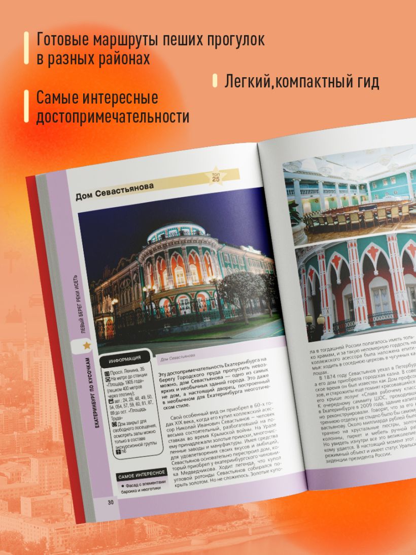 В путеводителе вы найдете описания самых интересных мест в столице Урала, а сориентироваться на местности помогут готовые маршруты и карты, расположенные на страницах гида.