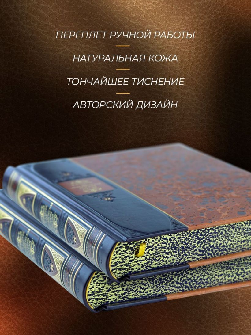 Книга в коллекционном составном переплете в стиле XIX века. Переплет изготовлен из двух видов натуральной кожи с тисненым рисунком, повторяющим узор мраморной бумаги ручной работы.