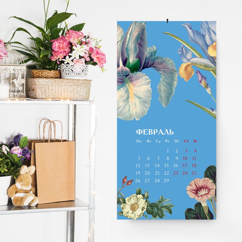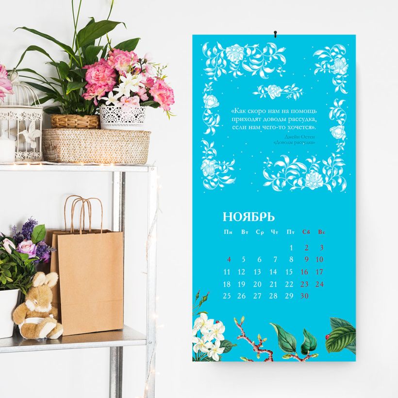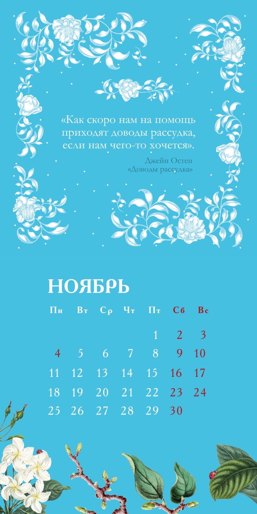 Календарь, вдохновленный книжной серией «Элегантная классика», в которой переосмысляется подача классических произведений. Оформление разворотов чередуется. Январь — минималистичный цветочный принт, обрамляющий цитату из классического произведения. Февраль — дизайнерское изображение цветов. На нижней части разворотов располагаются крупные четкие цифры и продолжение цветочного принта. На каждый месяц подобраны цитаты из произведений: «Гордость и предубеждение», «Маленькие женщины», «Маленькая хозяйка Большого дома» и другие.