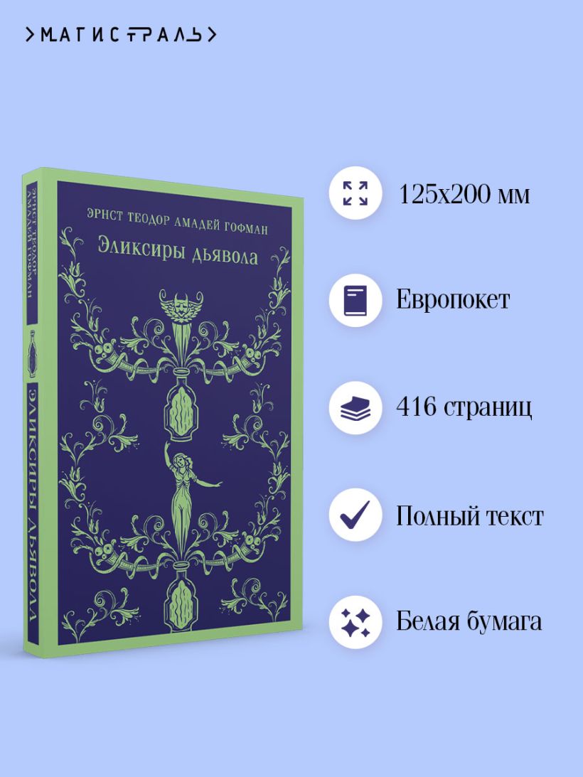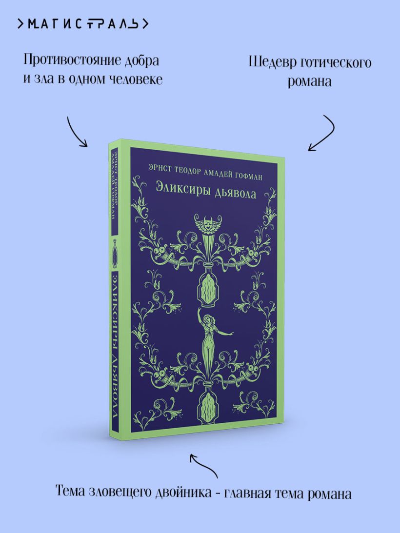 В данном издании представлен роман «Эликсиры дьявола», посвященный любимой для Гофмана теме разрушительного действия темной половины человеческой личности. Причем вторжение зла в душу человека обуславливается как наследственными причинами, так и действием внешних, демонических сверхъестественных сил. Главное действующее лицо монах Медардус, случайно отведав таинственной жидкости из хрустального флакона, становится невольным носителем зла. Повествование, ведущееся от его лица, позволяет последовать по монастырским переходам и кельям, а затем по пестрому миру, и испытать все, что перенес монах в жизни страшного, наводящего ужас, безумного и смехотворного...