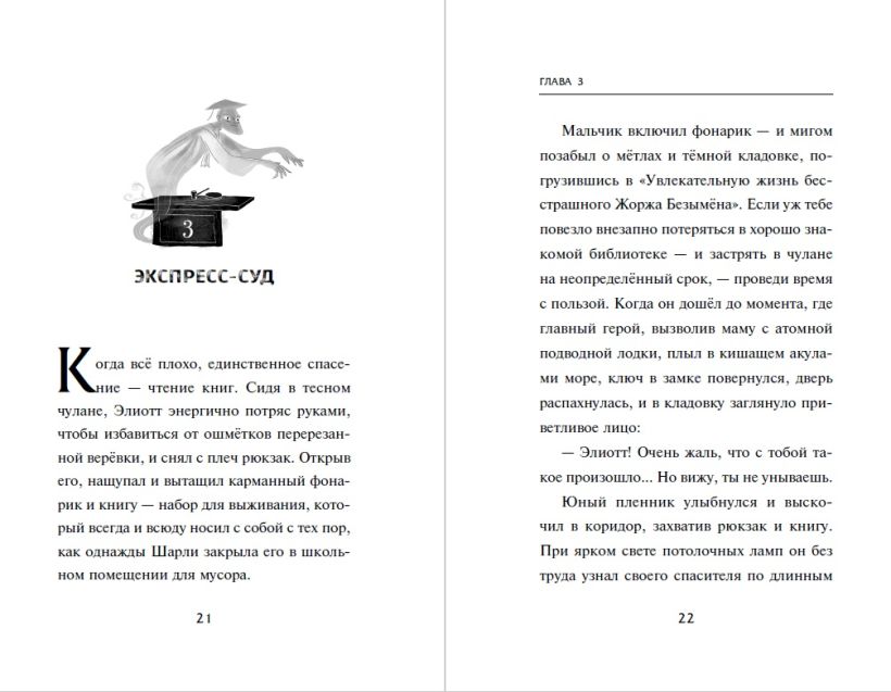 В день, когда начались его приключения, Элиотт убегал от хулиганов. Если честно, опять. И снова. Только на этот раз произошло кое-что неожиданное... Спрятавшись от преследователей, Элиотт случайно остался в библиотеке после закрытия — и как будто попал в другой, волшебный мир! Паренёк познакомился с очень строгим говорящим котом, дружелюбными механическими крысами, забывчивым привидением... И множеством необычных книг, одна из которых ему просто необходима. Ведь «Незаменимое руководство по защите от хулиганов» может решить все его проблемы! Осталось только поймать эту хитрую книжку...