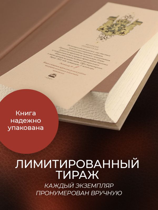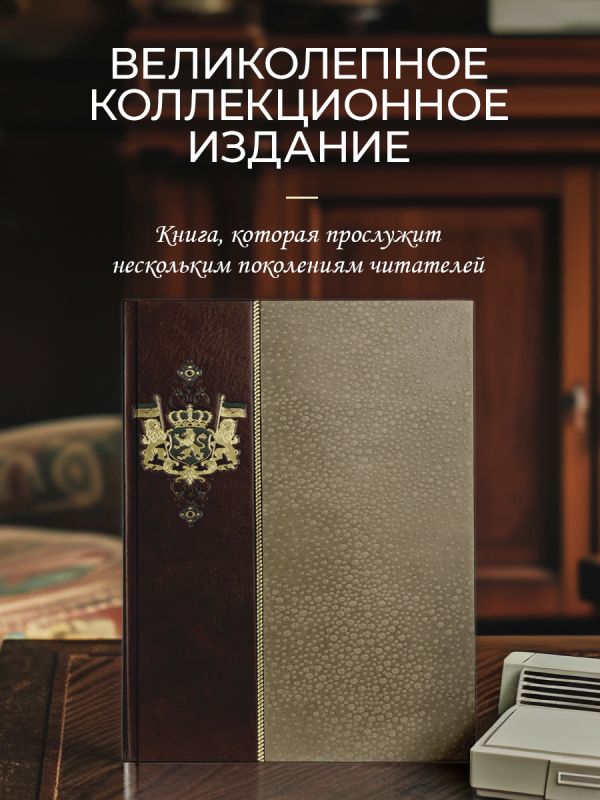 Коллекционное иллюстрированное издание в изящном составном кожаном переплёте ручной работы с торшонированным обрезом. Тираж 2022 года - 2 нумерованных экземпляра. Книги отпечатаны на бумаге премиум-класса и сшиты вручную на льняные нити. Переплеты созданы по традиционной для 19 века технологии из гладкой натуральной кожи двух цветов и украшены тремя видами тончайшего тиснения – золотым, рельефным и красочным. Украшает книгу изысканный тиснёный орнамент, обрамляющий символ серии – корона на пурпурном поле щита, поддерживаемого двумя львами, символами власти, великолепного качества рельефное тиснение дает особые тактильные ощущения. Форзацы книги сделаны из дизайнерской хлопковой бумаги. Каптал и ляссе из золотистого шёлка. В книгу помещен сертификат, отпечатанный на эко-бумаге, пронумерованный вручную. Великолепный подарок ценителям хорошей книги и мировой истории. Все книги серии оформлены в едином стиле и будут великолепно смотреться на книжной полке.
