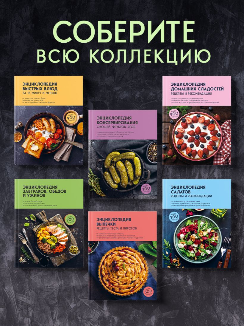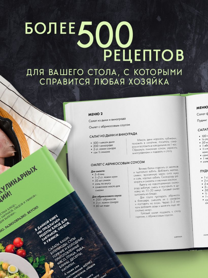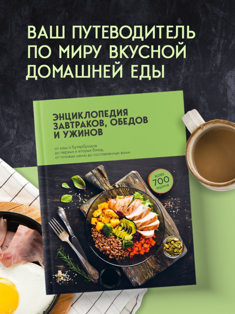 Знать заранее, что приготовить на завтрак, обед и ужин — желание каждой хозяйки, готовящей каждый день для своей семьи. Эта книга поможет вам быстрее ориентироваться в том, что, как и когда лучше подать на стол. Она поделена на главы ЗАВТРАКИ, ОБЕДЫ, УЖИНЫ, а внутри глав разделена на уже готовые меню и на отдельные виды блюд, присущие каждой трапезе. В конце книги вы найдете алфавитный указатель рецептов, который также облегчит поиск необходимого рецепта. А внутри блока текста размещены прекрасные цветные иллюстрации с дополнительными рецептами. Более 700 рецептов, выверенных, доступных и разнообразных. С этой энциклопедией жизнь на кухне станет легче!