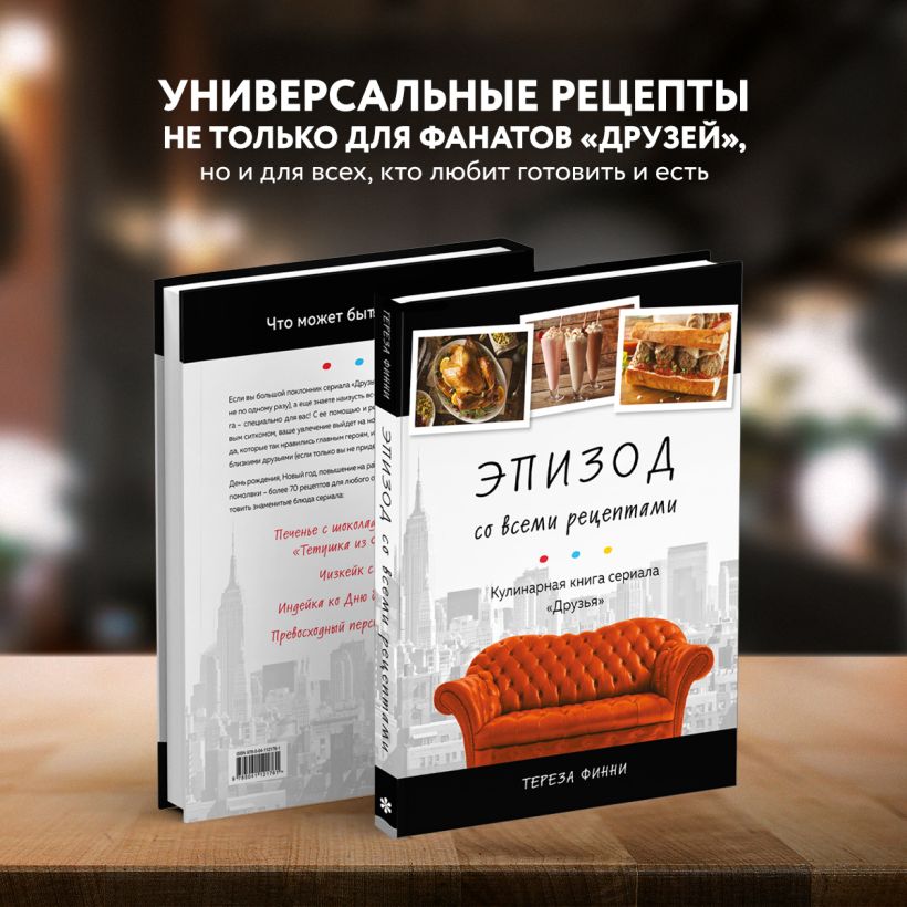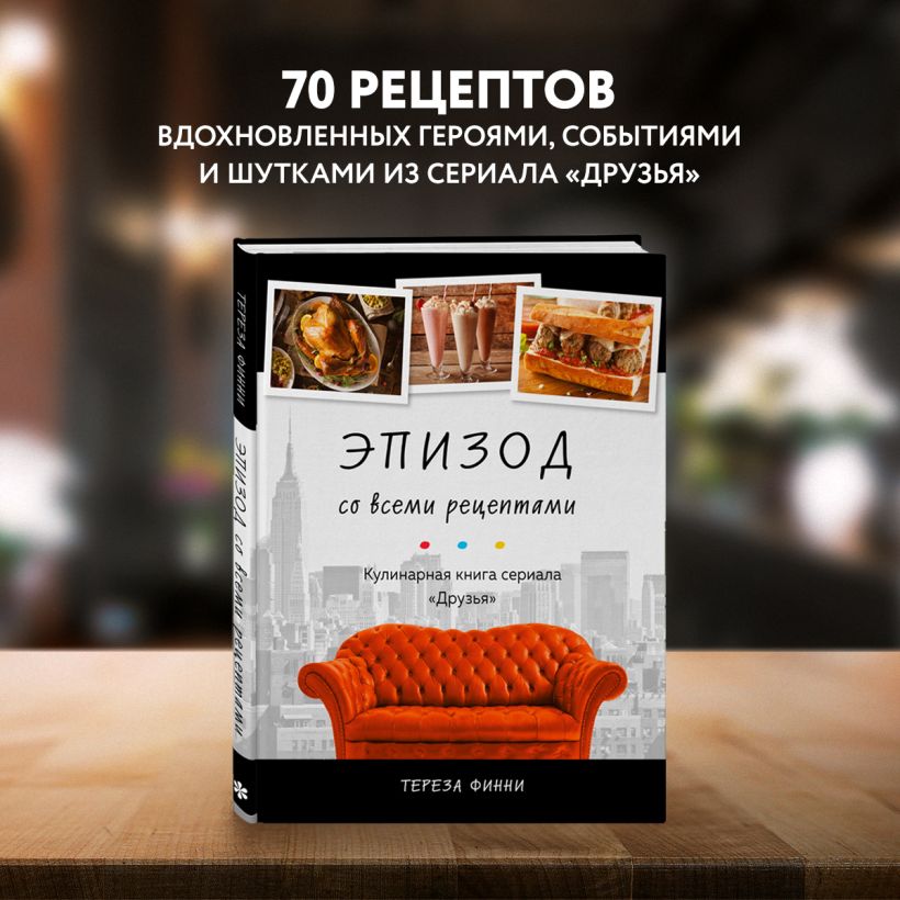 Для всех фанатов культового ситкома 90-х! Как и многие, Тереза Финни все свои юные годы наблюдала за тем, как Моника, Чендлер, Росс, Рейчел, Фиби и Джо работают, ходят на свидания, влюбляются, ссорятся и просто веселятся. И наблюдала, как еда была неизменным атрибутом и помощником героев. Мириться за чашечкой кофе, собрать всех на День Благодарения и приготовить самую сочную индейку, смотреть футбол, поедая огромную пиццу. Во всех ключевых событиях, происходящих с ребятами, участвовала и еда. И вот теперь Тереза создала свою собственную кулинарную книгу, в которой содержится более 70 рецептов, вдохновленных сериями, шутками и героями сериала.