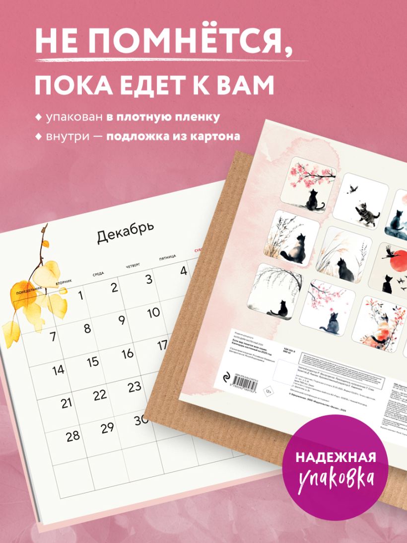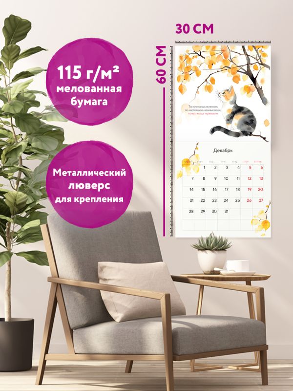 Календарь Татьяны Мужицкой с яркими иллюстрациями от Влады Коваль! В сетке — вдохновляющие цитаты автора и необычные праздники вроде «Всемирного дня “Спасибо”» и «Международного дня заботы о себе». Каждый месяц — как напоминание: жить можно с радостью, легкостью и любовью к себе. Совокупный тираж книг Татьяны Мужицкой — 360 000 экземпляров. Наши настенные календари отличаются высоким качеством исполнения! Тщательно подобранные иллюстрации, напечатанные на глянцевой бумаге высочайшего качества, станут настоящим украшением дома, а в календарной сетке найдется место для ваших планов: большие клетки позволят делать записи и организовать свой год! В серии настенных календарей издательства «ЭКСМО» каждый найдет тему по вкусу: великие художники, великолепные подборки с самыми знаменитыми произведениями искусства, легендарные кинематографические саги и игры, главные книжные авторы и бестселлеры, фотографии и иллюстрации любимых животных и многое-многое другое! Технические параметры: - Тип календаря — настенный перекидной. - Год — 2026. - Календарная сетка — с разбивкой по месяцам. - Вид скрепления — скрепка. - Ширина — 30 см. - Высота — 30 см. - Внутренний блок — мелованная бумага 150 г/м2. - Подложка — плотный гофрокартон для поддержания формы. - Индивидуальная упаковка в плотный целлофановый пакет.