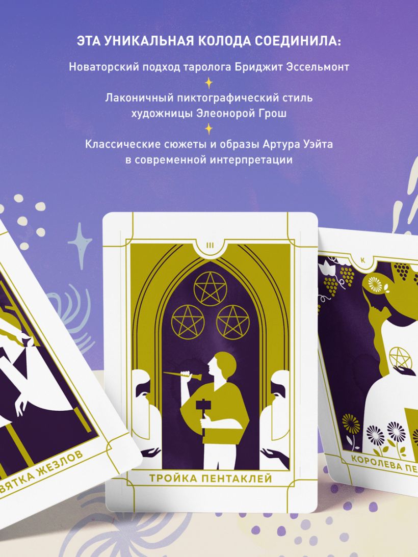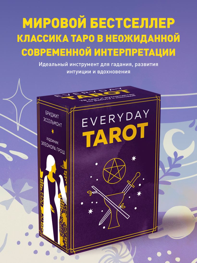 Everyday Tarot — «Таро на каждый день» — колода для тех, кто предпочитаете проверенную временем классику, но готов взглянуть на нее с неожиданной стороны. «Ничего лишнего» — вот девиз этого миниатюрного Таро, ставшего мировым бестселлером (более 5000 отзывов на Amazon!), благодаря выверенному сочетанию классического и новаторского подходов. Его создатели, таролог Бриджит Эссельмонт и художница Элеонора Грош, представили привычные образы Таро Артура Уэйта в лаконичном пиктографическом стиле, используя всего три цвета и бережно сохранив символику и сюжеты.