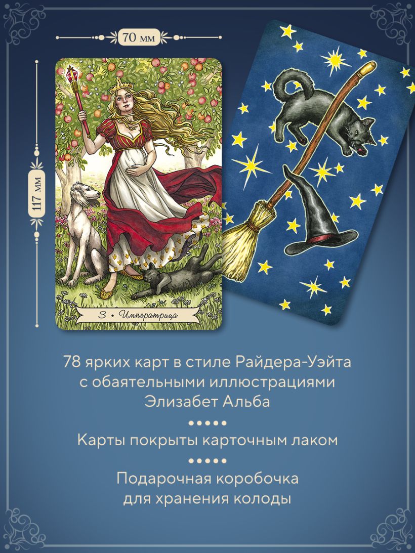 - Красочная колода из 78 карт с иллюстрациями художницы Элизабет Альба, созданная в традициях Таро Райдера — Уэйта.