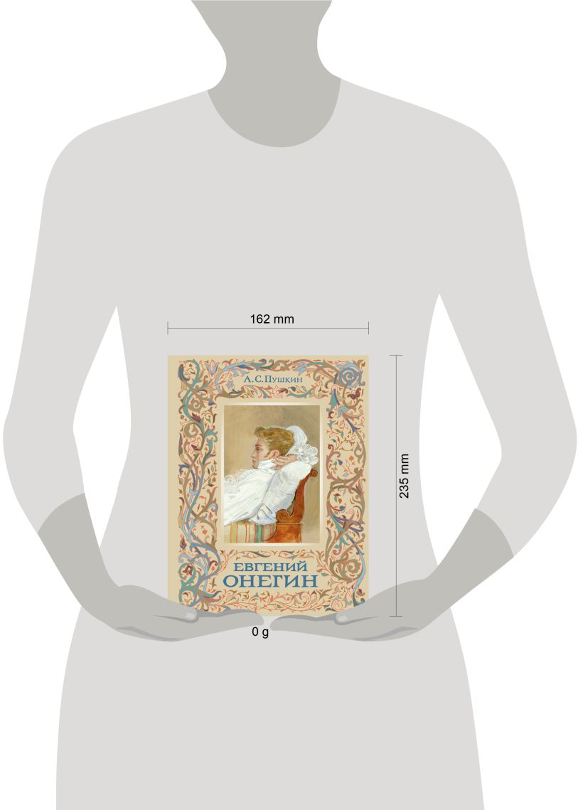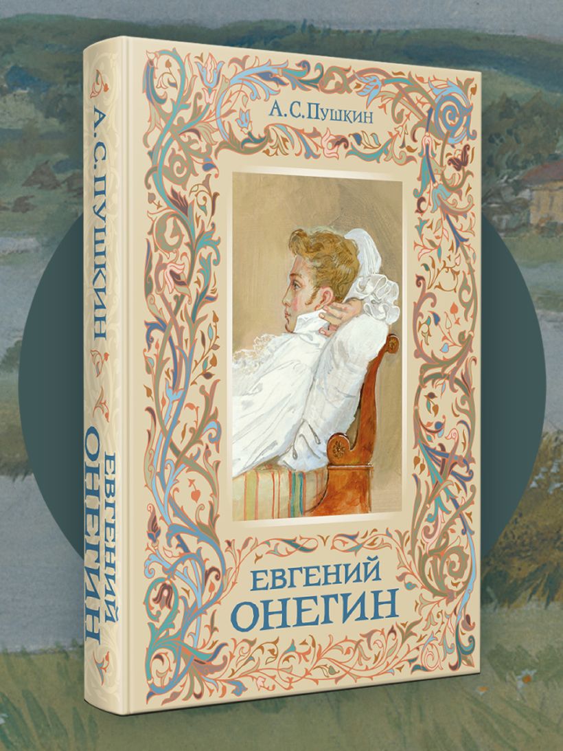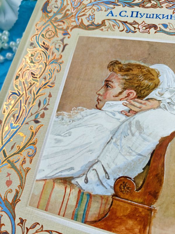 Золотомедное тиснение узора на обложке, эфалин, фольга, оттиск под картину с Евгением Онегиным, бежевый каптал и ляссе. В саму книгу взят плотный, в 120 г, белый офсет и произведена бережная печать с абсолютной цветопередачей картин художника.