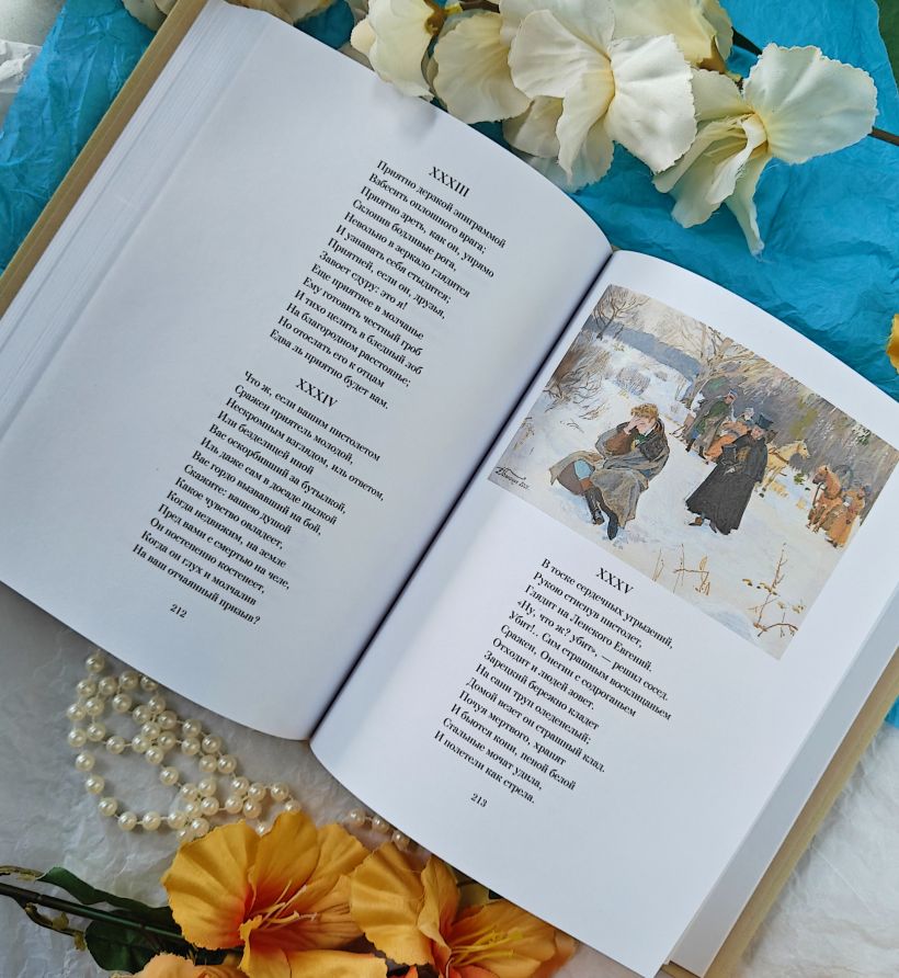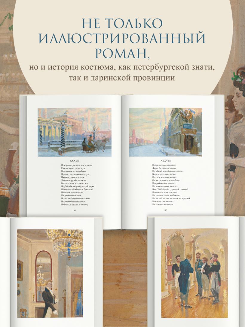 Дмитрий Анатольевич Белюкин, народный художник России, академик, описал своей палитрой красок каждую страницу романа. Это не только иллюстрированный роман, но и история костюма, как петербургской знати, так и ларинской провинции.