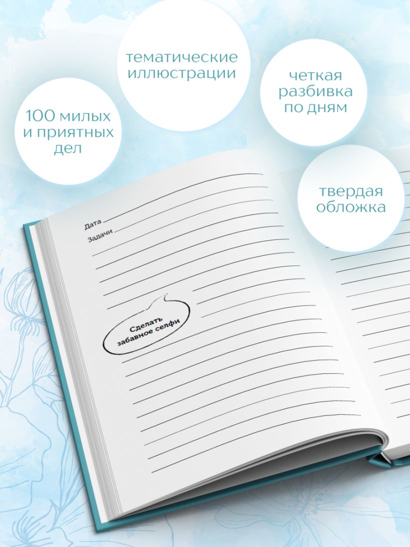 Позитивный планер для поднятия настроения. Внутри него вы найдете 100 милых и приятных дел — маленьких радостей, а еще забавные тематические иллюстрации, которые сделают планирование интереснее.