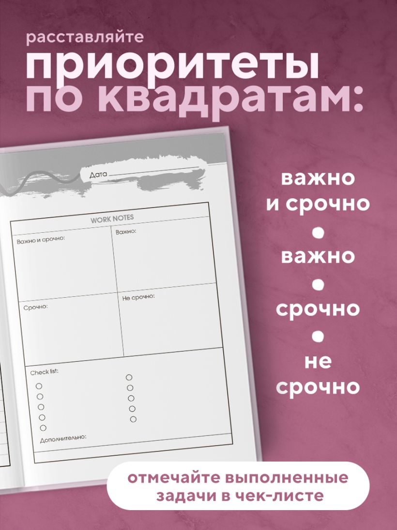Ежедневник имеет сшитый внутренний блок из офсетной бумаги. Расставьте приоритеты для каждого дела, и вы поймете, что должно идти в первую очередь. Функциональный блок поможет вам в этом. Внутри вы найдете удобное разделение на месяц, неделю, день и место для записей.