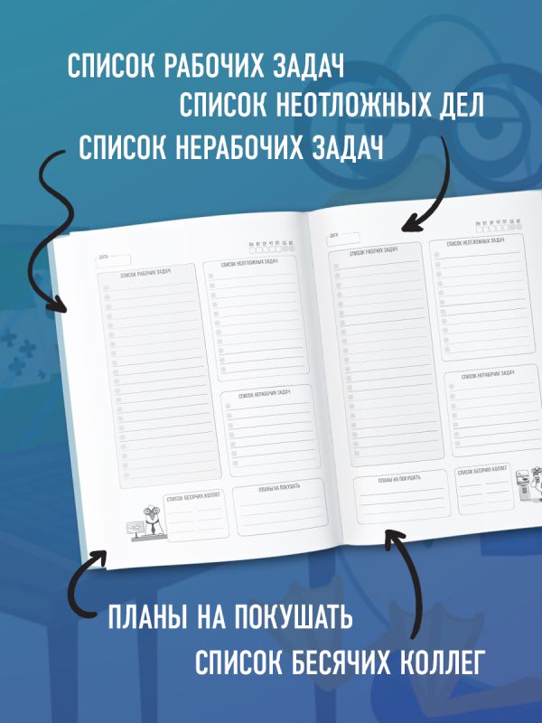Этот ежедневник — ваш личный психотерапевт в мире корпоративного абсурда. Ежедневник разделен на два раздела: утренний и вечерний. Здесь нет глянцевых мотивационных цитат, зато есть ироничные разделы. Утренний: • «Важные дела, которые увидит начальник» • «Делать не хочется, но надо» • «Можно проигнорировать, если повезет» Вечерний: • «Где я психанул» • «Моя микропобеда» Недатированный формат позволяет вести ежедневник в любое время