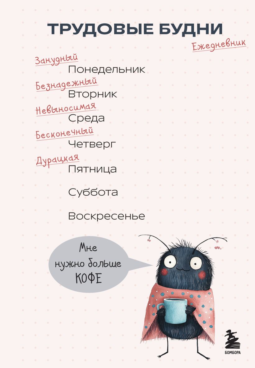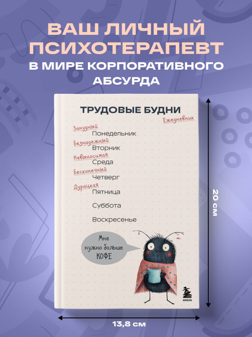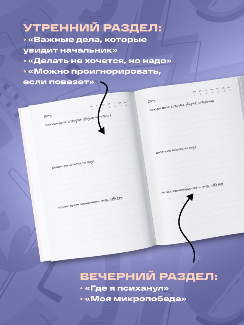 Этот ежедневник — ваш личный психотерапевт в мире корпоративного абсурда. Ежедневник разделен на два раздела: утренний и вечерний. Здесь нет глянцевых мотивационных цитат, зато есть ироничные разделы.