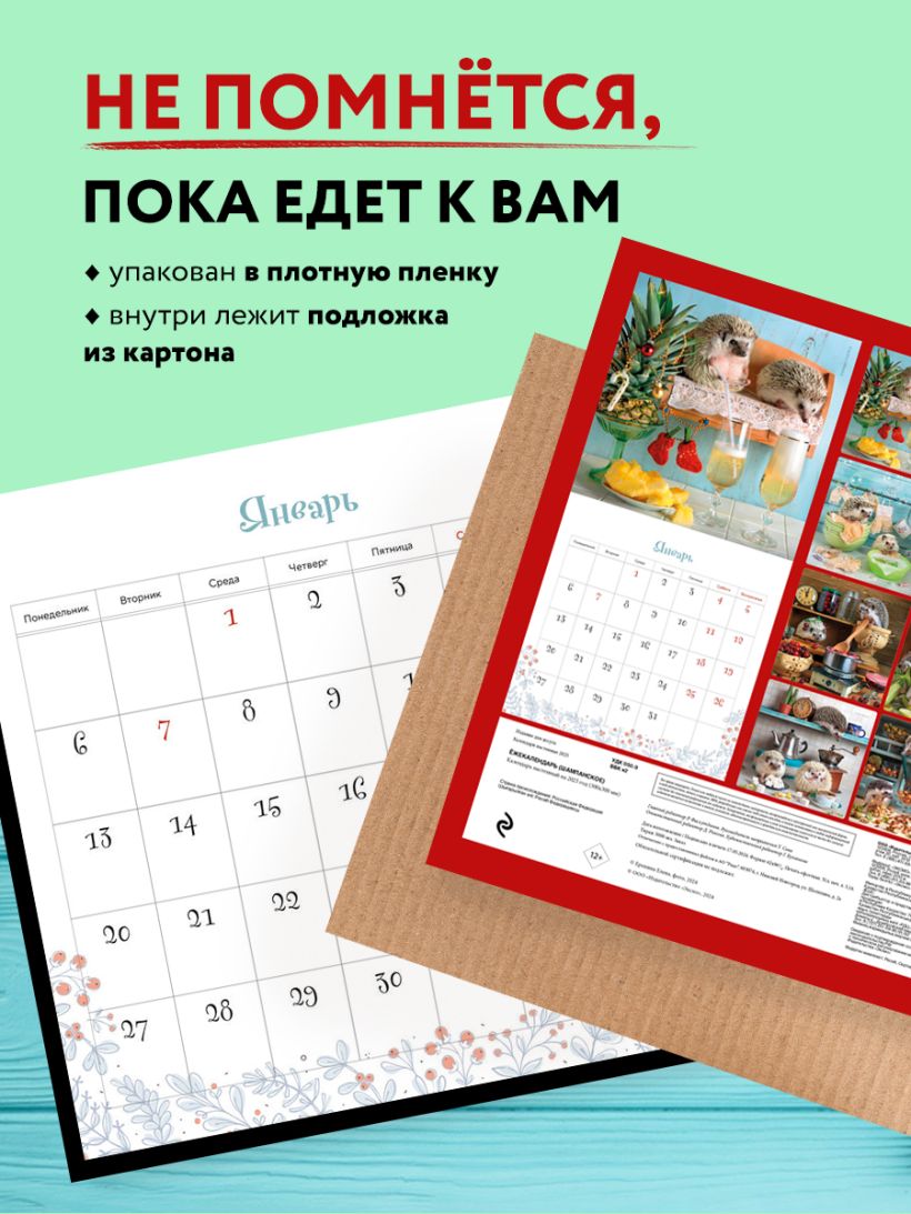 Очаровательные ёжики известного питерского фотографа Елены Ерёминой снова в деле! Планируйте дела ЁЖЕдневно, не забывая о праздничных и выходных днях, которые отмечены в календаре! Каждый месяц — новая фотография славного ежиного семейства, удобная календарная сетка и хорошее настроение!