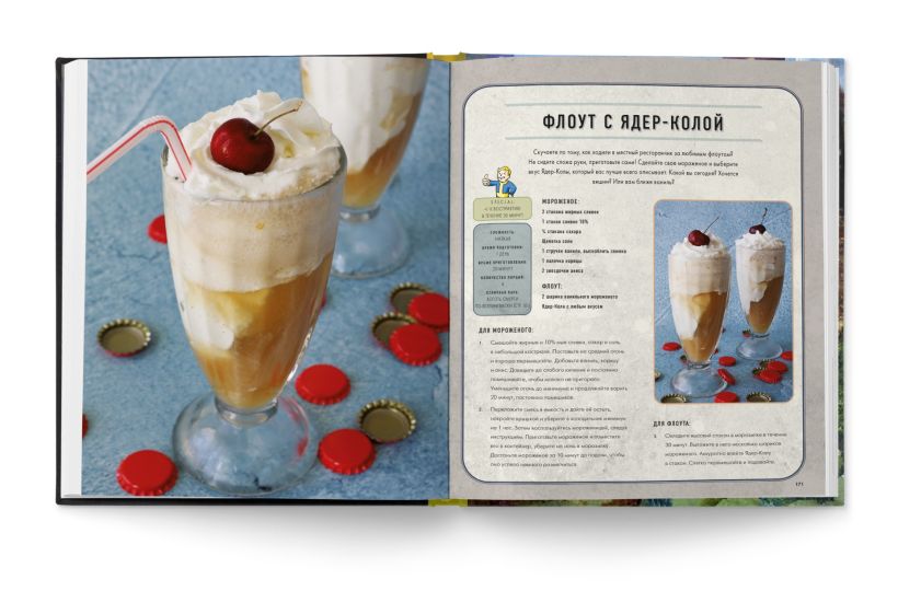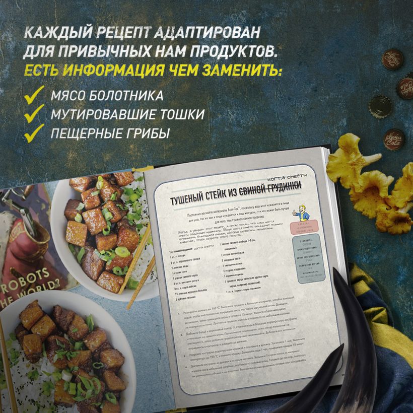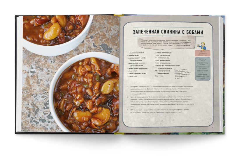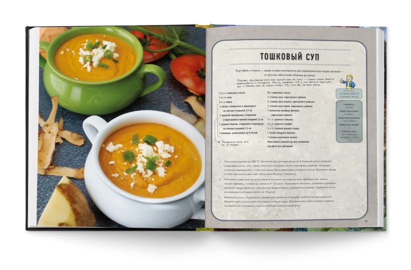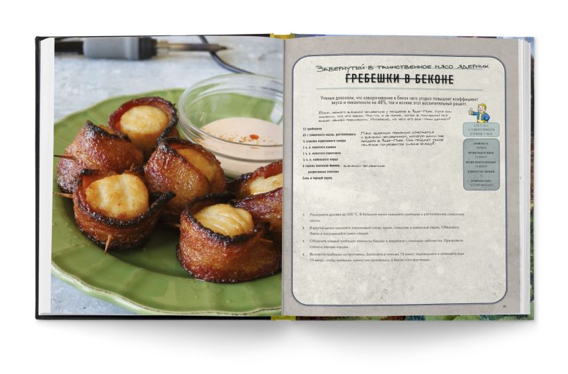 И если боевые навыки остаются на вашей совести, то с едой мы поможем. Поваренная книга, созданная компанией «Волт-Тек» и дополненная ценными замечаниями жителя убежища, не даст умереть на просторах Пустоши (и кухни).