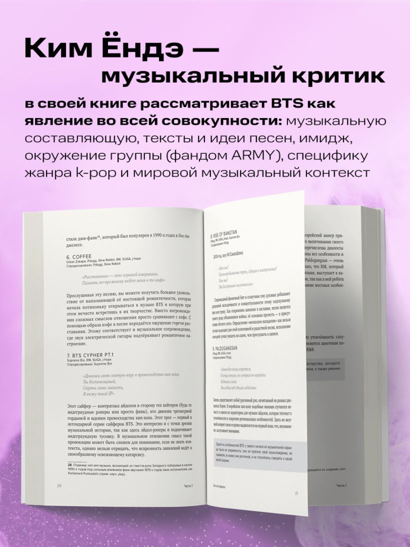 В чем уникальность BTS? В чем кроется секрет их популярности и такой безграничной любви со стороны фанатов, которые называют себя ARMY? В своей книге Ким Ёндэ, южнокорейский музыкальный критик, попытался ответить на эти и другие вопросы, возникающие в связи с феноменом BTS. Для этого он сделал подробный обзор дискографии группы, изучил историю возникновения жанра K-pop, взял интервью у людей, работавших с BTS, и попытался объяснить, как вокруг группы сложился такой фандом. Особое внимание Ким Ёндэ уделяет музыкальной составляющей, ведь именно в музыке BTS отразился дух и философия группы, ее искренность и энергия. Бестселлер в новом оформлении позволит по-новому взглянуть на творчество BTS и их путь в музыкальной индустрии.
