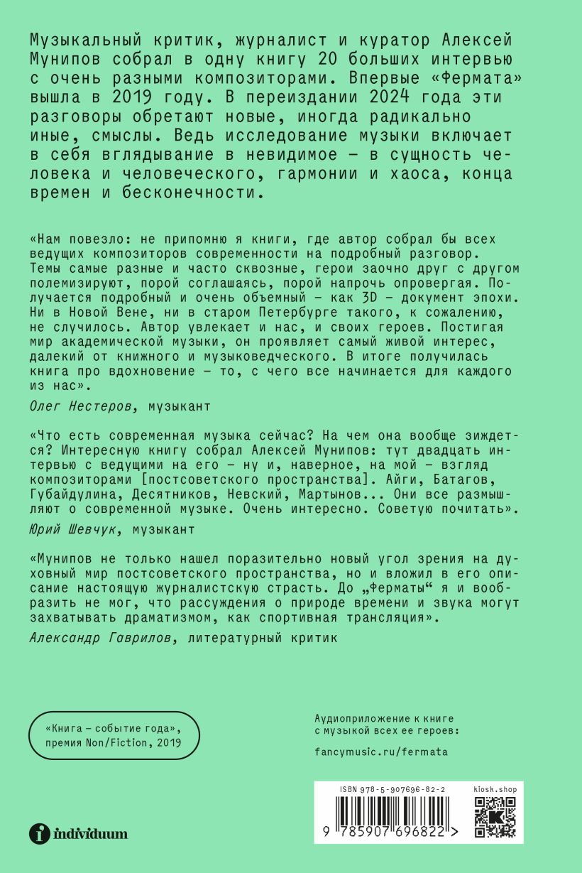 Музыкальный критик, журналист и куратор Алексей Мунипов собрал в одну книгу 20 больших интервью с очень разными композиторами. Впервые «Фермата» вышла в 2019 году. В переиздании 2024 года эти разговоры обретают новые, иногда радикально иные смыслы. Ведь исследование музыки включает в себя вглядывание в невидимое — в сущность человека и человеческого, гармонии и хаоса, конца времен и бесконечности.
