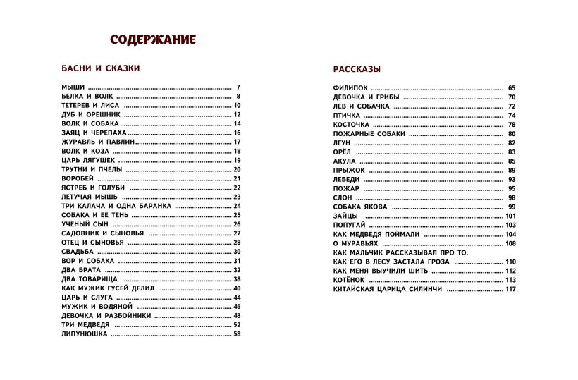 В книгу вошло 50 известных коротких и поучительных рассказов, басен и сказок, написанных для детей Львом Толстым и вошедших в его знаменитую «Азбуку», а именно: «Собака и её тень», «Учёный сын», «Отец и сыновья», «Как мужик гусей делил» и другие.