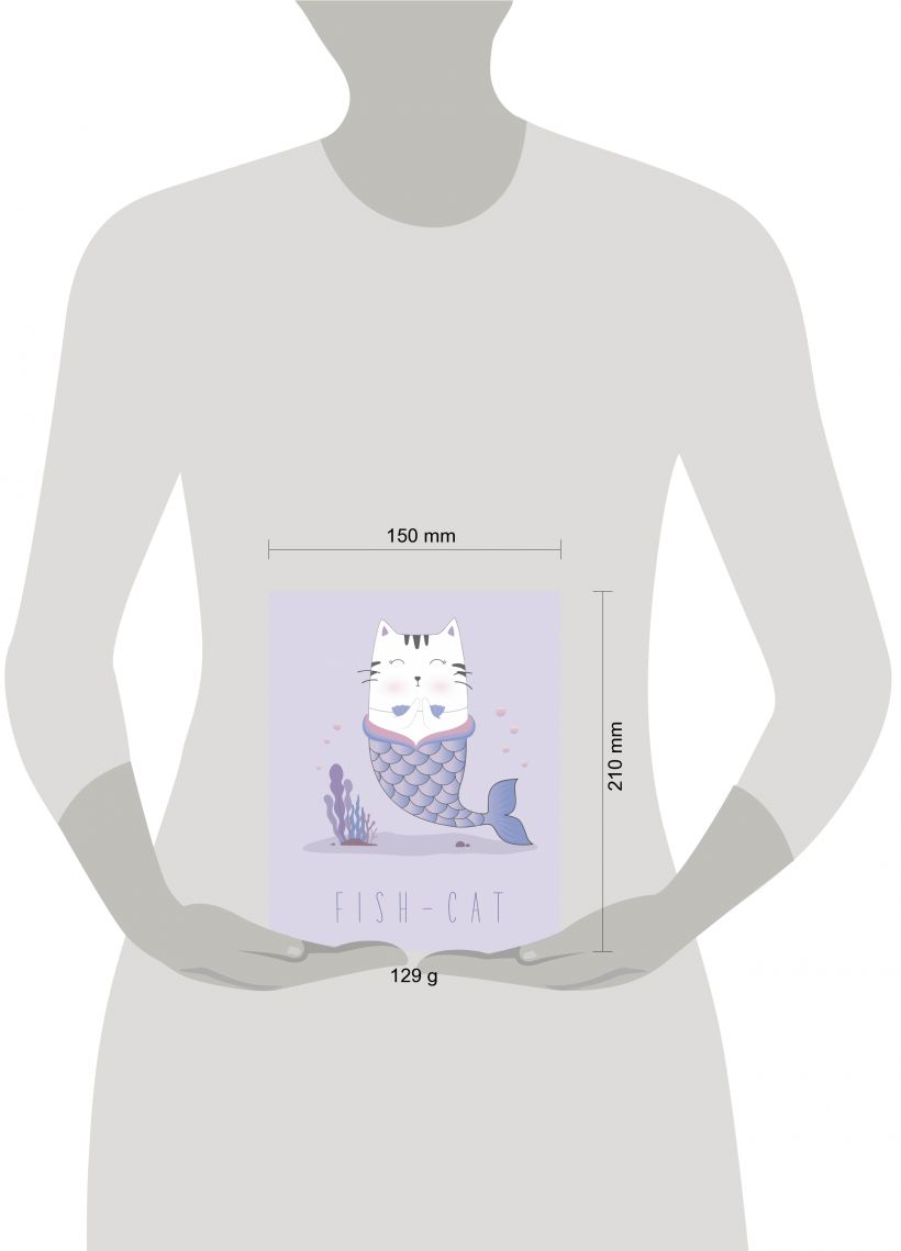 Тетрадь общая «Fish–cat» представлена в формате А5, подойдет как школьнику, так и студенту. Обложка тетради выполнена из картона и декорирована глянцевым лаком. Блок выполнен из офсетной бумаги и состоит из 96 страниц, соединен металлическими скобами. Скругленные уголки, накидка на блок в дизайн обложки! Такой дизайн придется по душе всем, кто ценит милые иллюстрации.