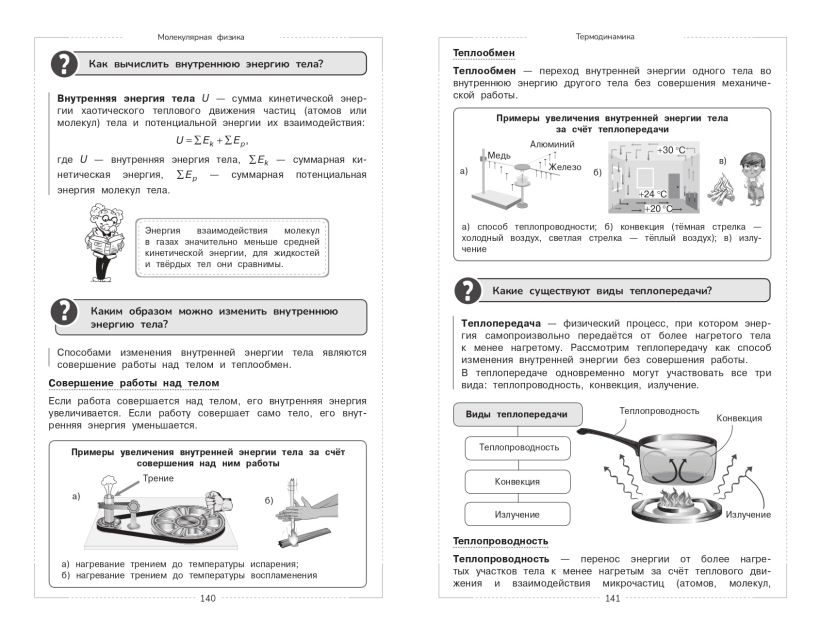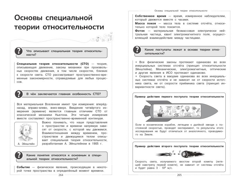 Иллюстрированный справочник по физике станет незаменимым помощником школьника при подготовке к урокам, ОГЭ и ЕГЭ! Если вы путаетесь в законах, понятиях и не можете уложить в голове весь объёмный материал за школьный курс, то это пособие идеально вам подойдёт. В книге нет длинных и скучных текстов — весь материал разбит по коротким рубрикам, таблицам и схемам, которые дополняют иллюстрации. Важная информация подаётся через вопросно-ответную форму с элементами комиксов. Такая форма изложения теории сделает обучение не только эффективным, но и интересным. В книге представлены разделы «Механика», «Молекулярная физика», «Электродинамика», «Оптика», «Теория относительности», «Квантовая физика». Помимо этого, пособие содержит тренировочные задания с ответами и подробными решениями. Справочник станет отличным подарком ученикам средней и старшей школы, которые только начинают изучать физику или хотят углубить свои знания. Книга прослужит не один год благодаря интегральному переплёту и качественной полиграфии. Пособие будет полезно не только школьникам, но и учителям при составлении плана уроков, а также родителям, которые хотят освежить в памяти школьную программу.