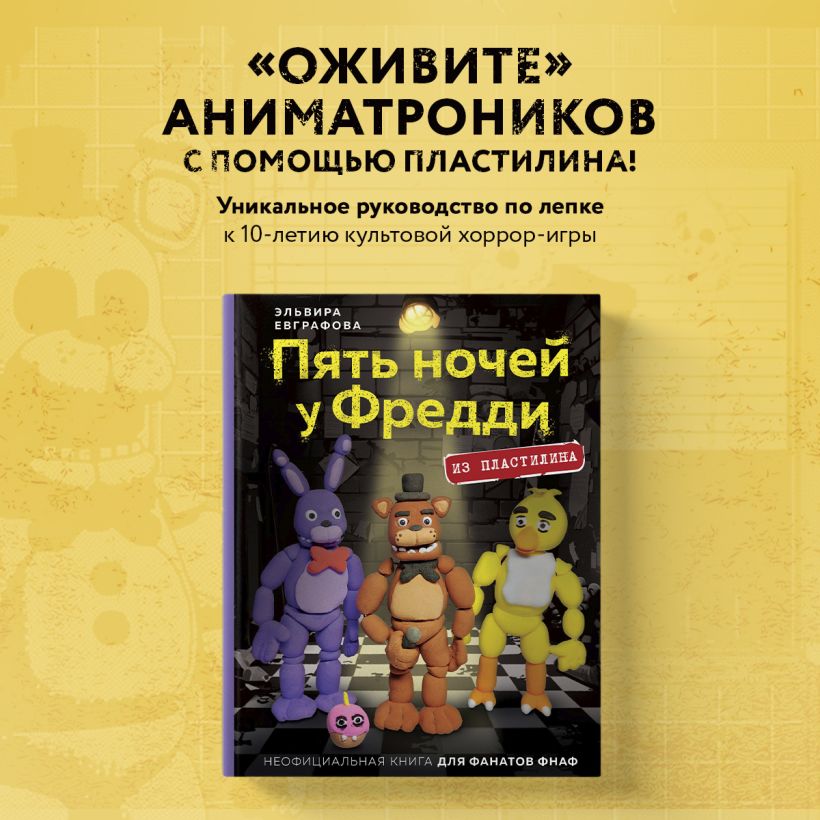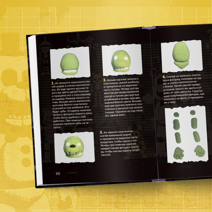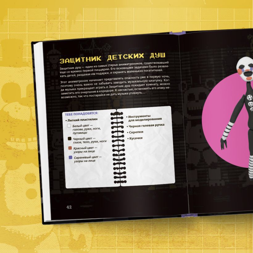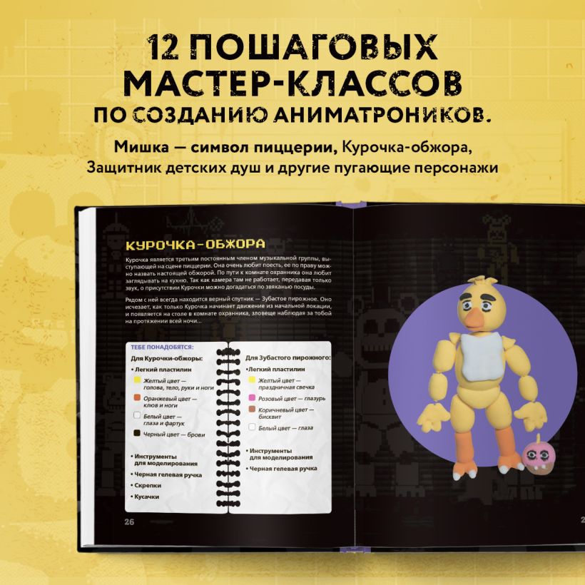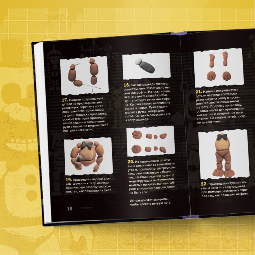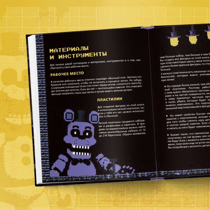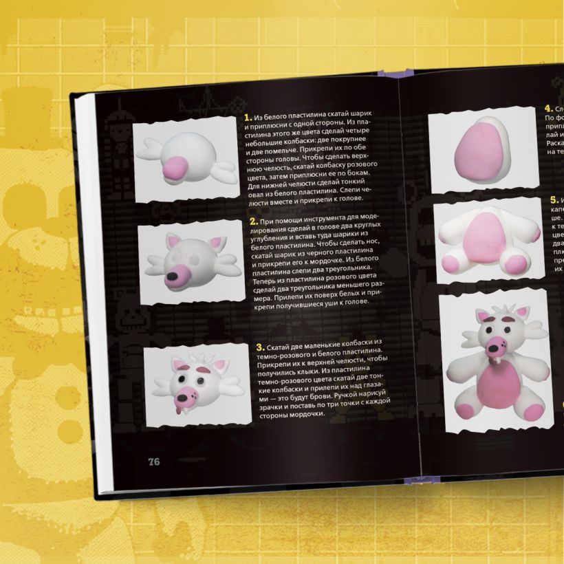Внутри тебя ждут понятные пошаговые мастер-классы по лепке из легкого пластилина. Ты узнаешь все тонкости и секреты работы с этим материалом. Подробные инструкции и красочные иллюстрации помогут не запутаться и получить максимум удовольствия от процесса! А интересные факты об аниматрониках, которые ты найдешь на страницах, позволят узнать больше о любимой вселенной и проникнуться мрачной атмосферой заброшенной пиццерии 80-х.