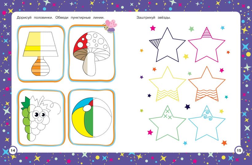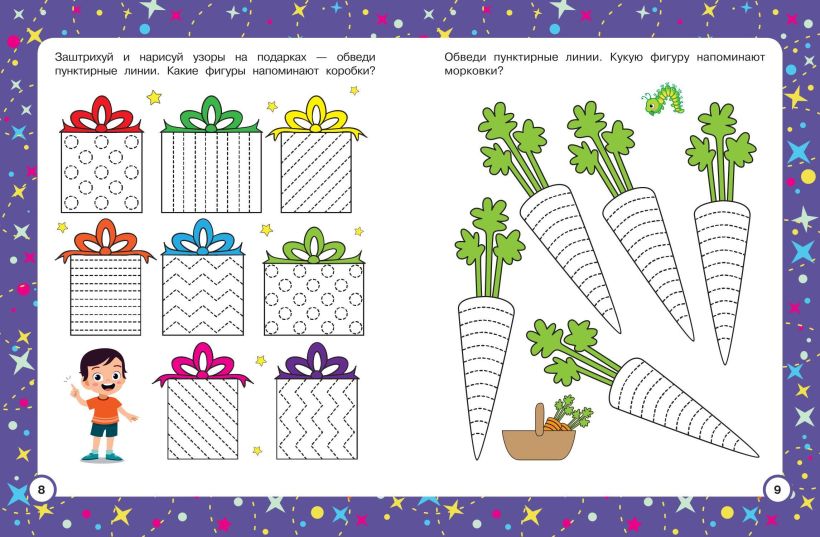 Занимаясь, дошкольник будет обводить формы по пунктирным линиям и превращать их в разные предметы, раскрашивать и штриховать, что способствует лучшему запоминанию.