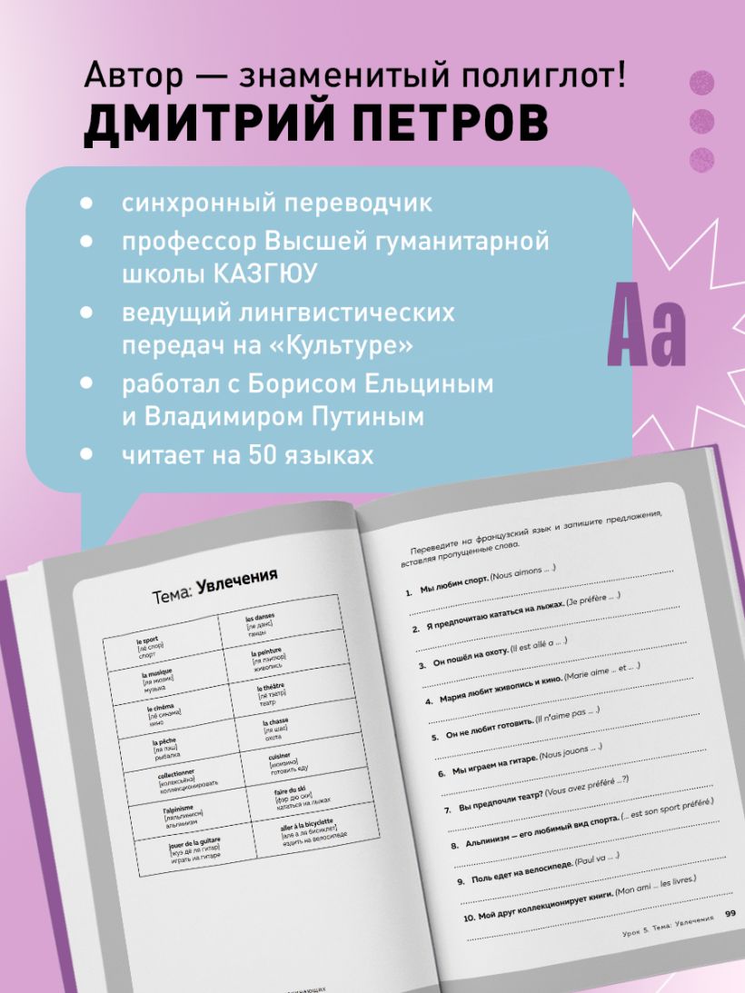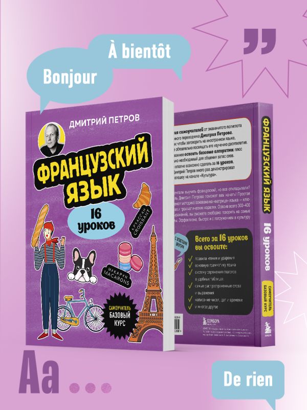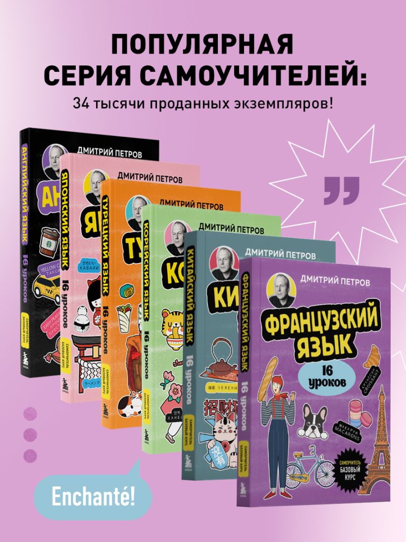 Это серия самоучителей от знаменитого полиглота и синхронного переводчика Дмитрия Петрова. Он уверен: чтобы заговорить на иностранном языке, совсем не обязательно посвящать его изучению десятилетия. Гораздо важнее освоить базовые алгоритмы, плюс — минимально необходимый для общения запас слов.