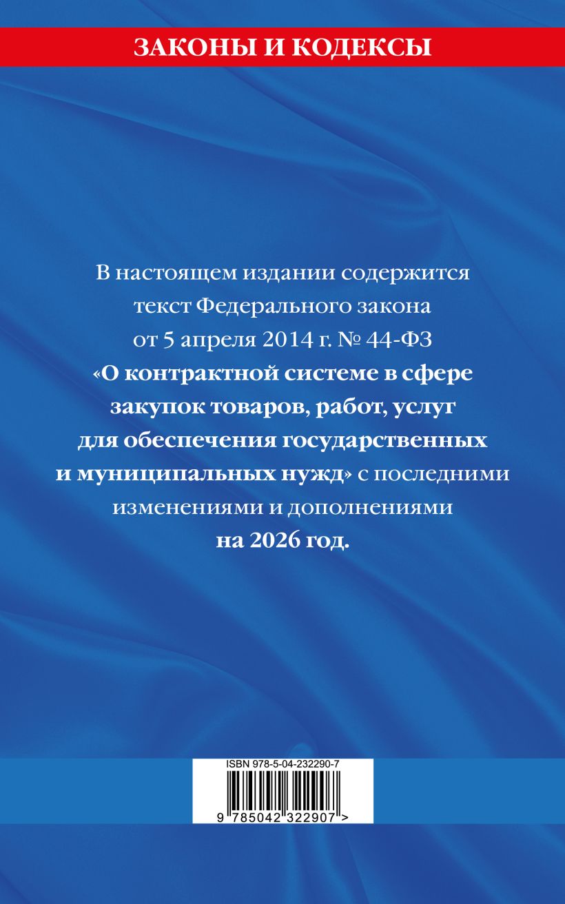 В настоящем издании содержится текст Федерального Закона от 5 апреля 2014 года № 44-ФЗ "О контрактной системе в сфере закупок товаров, работ, услуг для обеспечения государственных и муниципальных нужд" с изменениями и дополнениями на 2026 год. В данной книге приводится вся актуальная информация на дату подписания издания в печать.