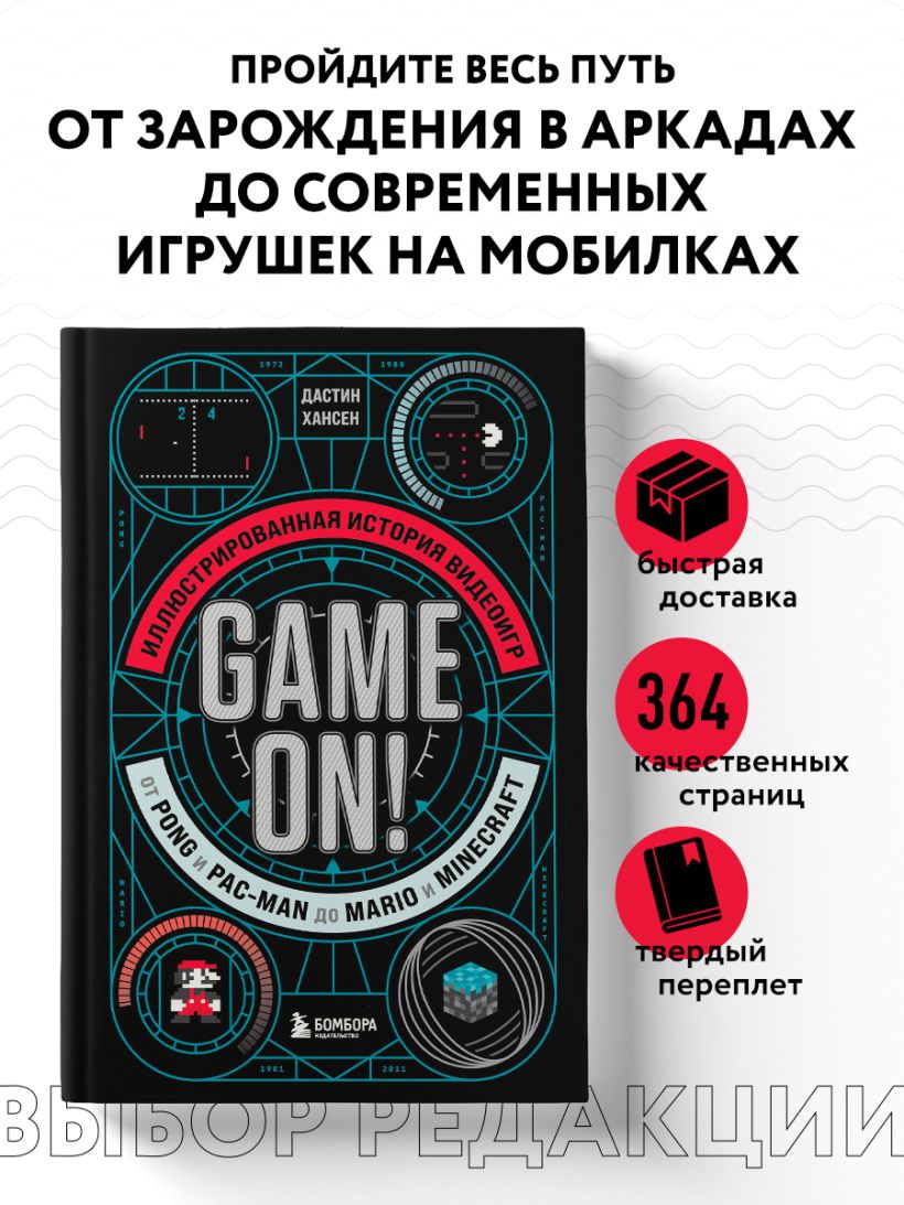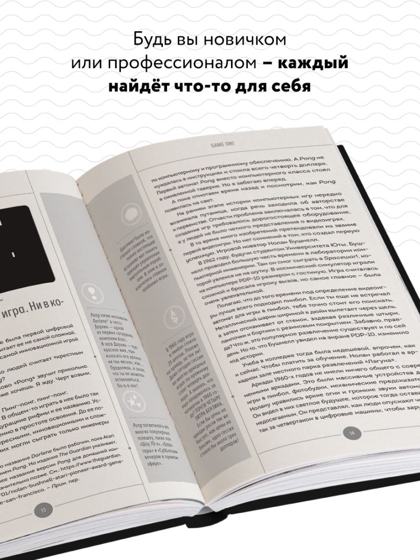 Внутри вас ждет исторический обзор развития видеоигр от появления первых аркадных автоматов до современных технологий — подробный, но написанный простым и увлекательным языком. Занимательные факты, рассказы о создании игр, пасхалки и множество иллюстраций позволят вам по-настоящему погрузиться в мир видеоигр и узнать много нового об этой увлекательной индустрии.