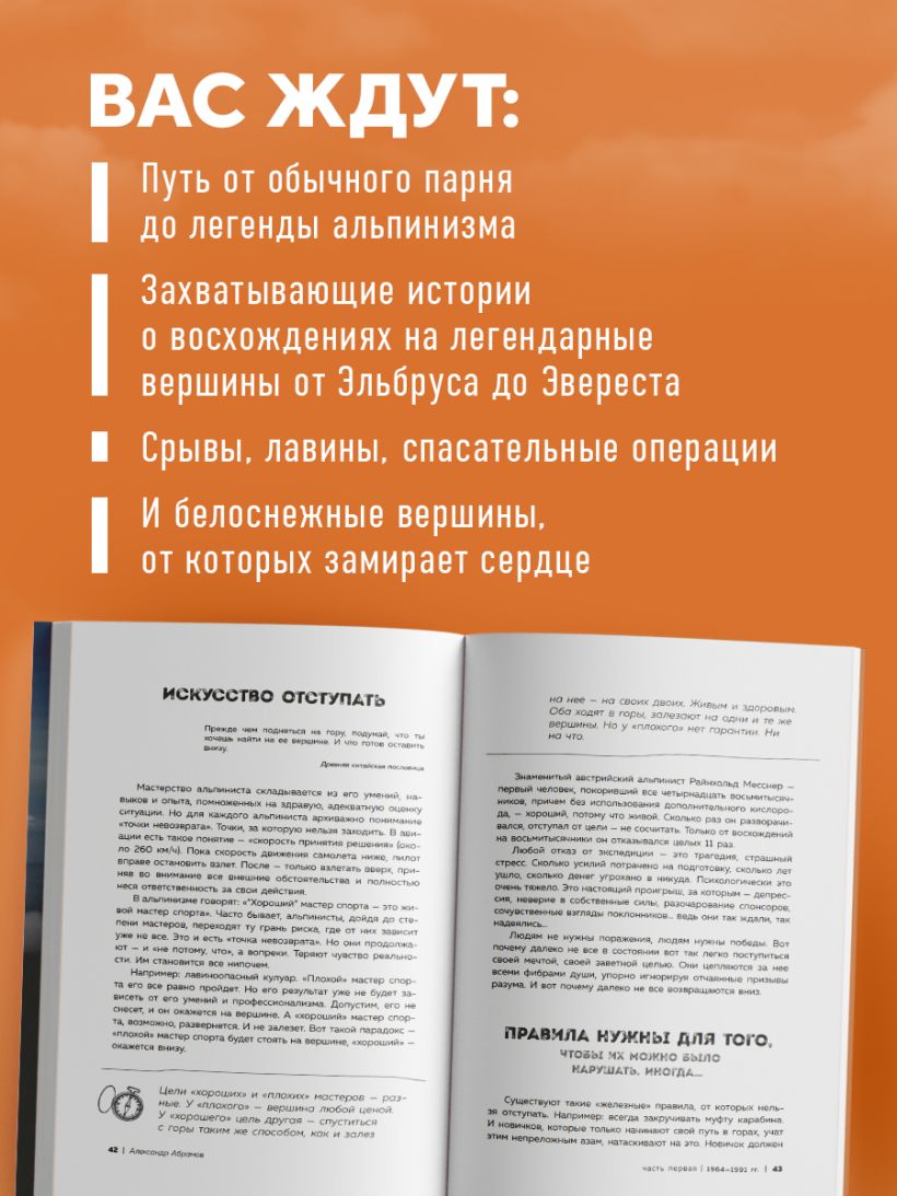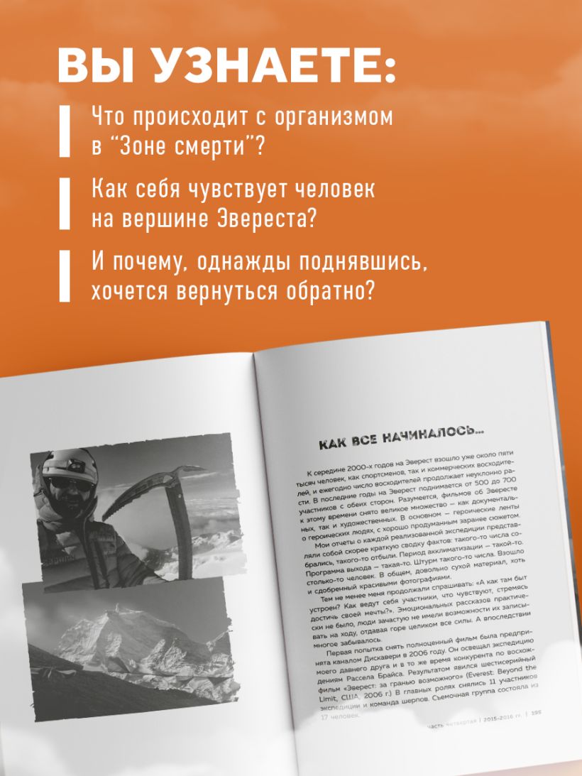 Перед вами захватывающая биография в новом удобном формате. В каждой из глав автор рассказывает о своем пути с самого начала — от посвящения в альпинисты и покорения Эльбруса на машине до гонки за первенство с Федором Конюховым и создания самой сильной команды в сфере экстремальных восхождений!